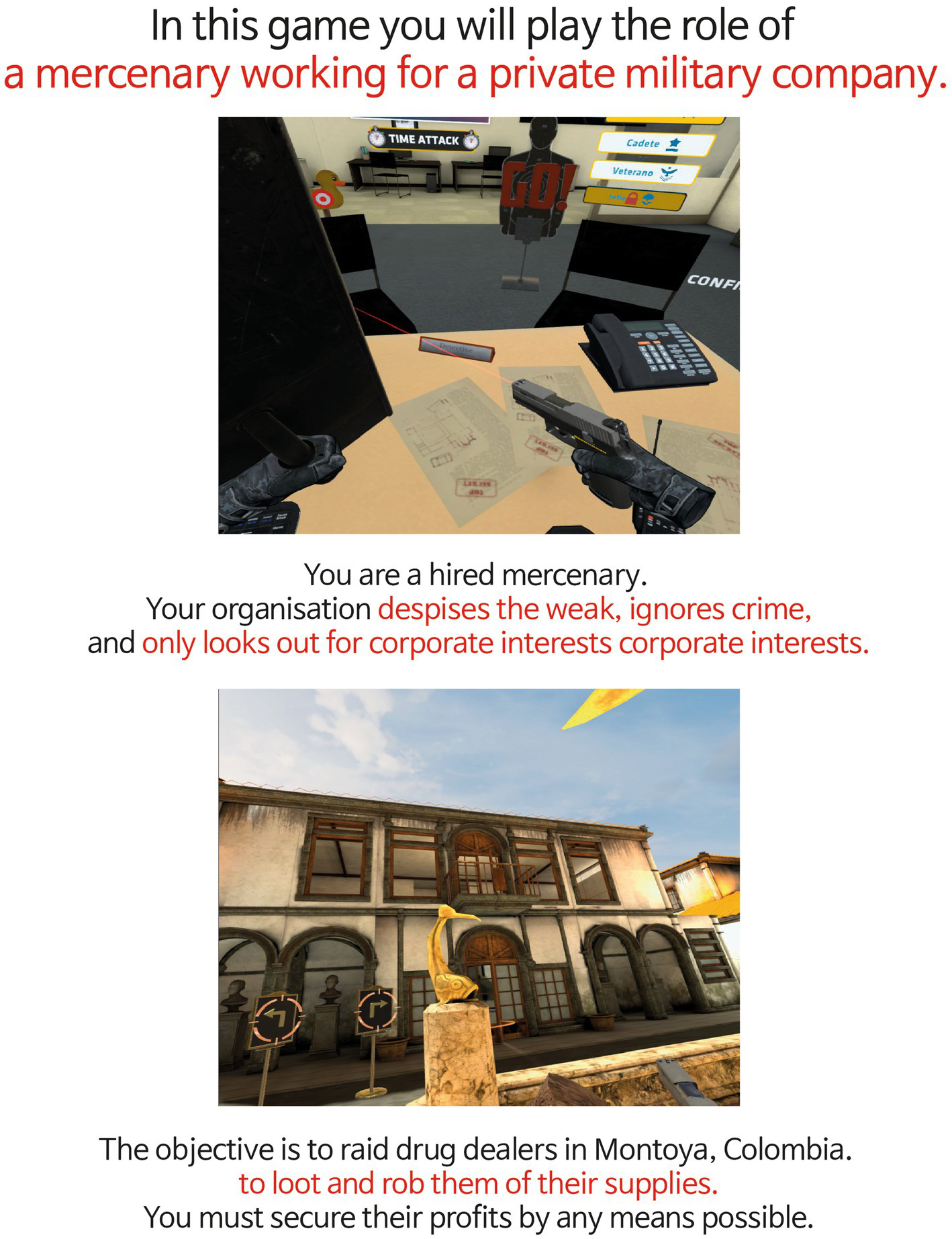 In PLAYER BAD condition, participants read the following narrative: “In this game you will play the role of a mercenary working for a private military company. You are a hired mercenary. Your organization despises the weak, ignores crime, and only looks out for corporate interests. The objective is to raid drug dealers in Montoya, Colombia, to loot and rob them of their supplies. You must secure profits by any means possible.”