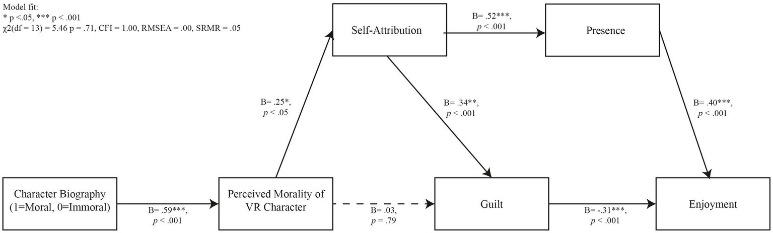 The evolution of virtual reality (VR) devices has significantly broadened the horizon of media consumption, particularly within the domain of video gaming. This immersive medium offers unparalleled depth to the gaming experience, potentially altering players’ psychological processes in unique and profound ways. Our investigation pivots on the intricate relationships among character morality, self-attribution, presence, guilt, and their collective influence on enjoyment in virtual reality gaming environments. Grounded in the theoretical bedrock of the Affective Disposition Theory (ADT) posited by Zillmann and Cantor (1976), this study delves into how players’ moral judgments about characters influence their enjoyment and engagement with media narratives.