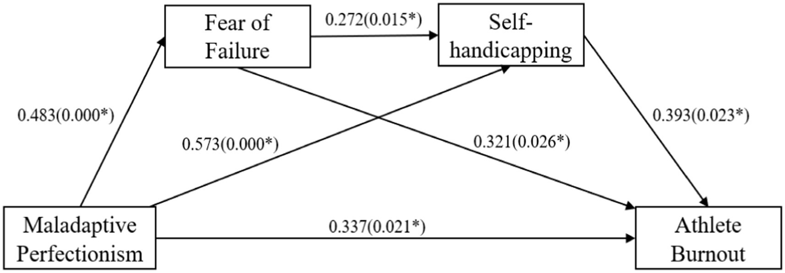 Analyses indicated that maladaptive perfectionism positively predicts fear of failure, self-handicapping, and athlete burnout. Fear of failure positively predicts self-handicapping and athlete burnout, while self-handicapping also predicts athlete burnout. In addition to the direct pathway, we identified three mediating pathways through mediation analyses: (a) an independent mediation of fear of failure (b) an independent mediation of self-handicapping (c) a chained mediation of both.