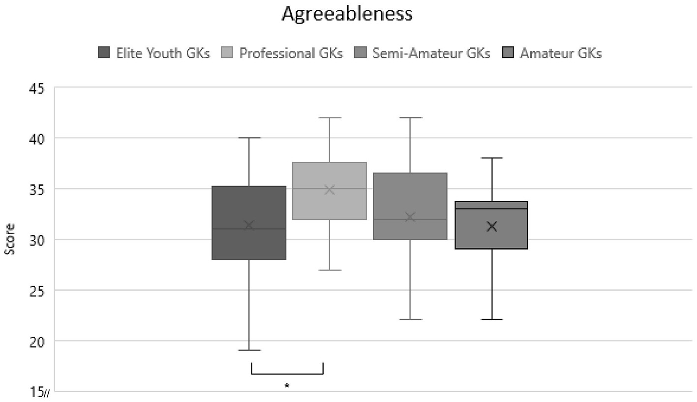 The first objective of the study was to examine differences in personality characteristics depending on expertise level and age, respectively. The MANOVA was significant at F(5) = 4.045, p = 0.002, η2 = 0.138. As the five personality values were compared with each other, a Bonferroni correction in the singular ANOVA with a new critical α of 0.01 was used. This value was only reached by agreeableness with F(3) = 3.983, p = 0.009, η2 = 0.085. This effect size indicates a medium effect. Post-hoc analysis using Bonferroni were done to clarify these results. As shown in Figure 1, they showed a significant difference between elite youth (M = 31.43, SD = 4.91) and pro GKs (M = 34.86, SD = 4.06). This indicates that pro GKs have a higher agreeableness score than elite youth GKs. No significant differences were found for the other personality traits or for the amateur groups and thus, hypothesis 1 is rejected.