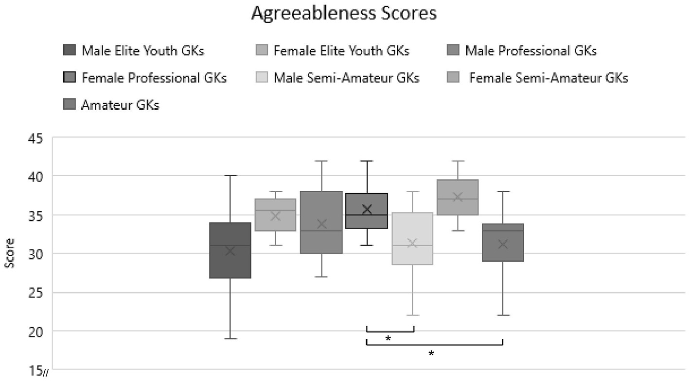 Pairwise comparisons further analyzed the differences in agreeableness and conscientiousness. In agreeableness, male elite youth GKs have significantly lower agreeableness scores than female elite youth GKs (difference = −4.60, p < 0.001), male pro GKs (difference = −3.26, p = 0.021), female pro GKs (difference = −5.35, p < 0.001) and female semi-pro/amateur GKs (difference = −6.93, p = 0.009). Furthermore, female pro GKs have higher scores than male semi-pro/amateur GKs (difference = 3.265, p = 0.021) and male youth semi-pro/amateur GKs (difference = 3.750, p = 0.03). For an overview of these results, refer to Figure 4. The last finding is in line with hypothesis 3 in the way that the female group of highest expertise (pro GKs) show higher agreeableness scores than male groups of lower expertise (semi-pro/amateur).