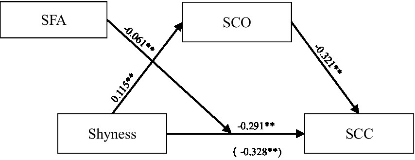 Table 1 presents the descriptive statistics and correlation matrix. Shyness was negatively connected to SCC and positively with social comparison orientation (SCO). SCC was negatively correlated with social comparison orientation (SCO) and self-focused attention (SFA).