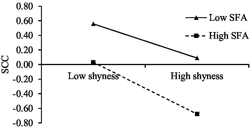 Self-focused attention moderated the relationship between shyness and SCC. SFA, self-focused attention; SCC, self-consistency and congruence.