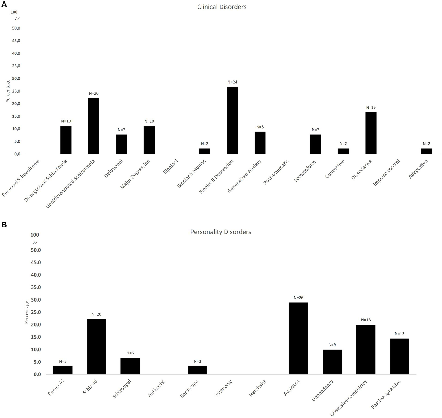 Percentage and number of the presence of the different psychopathological profile defined by PAI criterion; (A) major clinical disorders; (B) personality disorders.
