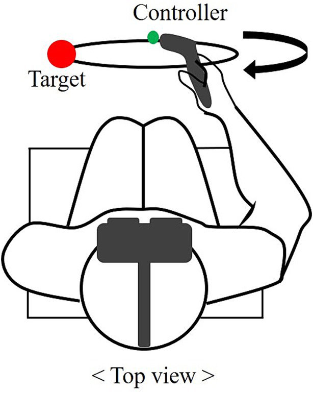 The motor timing task was created using the Unity 3D program (Unity 3D, Unity Technologies, United States) and implemented using a VR device (HTC VIVE PRO-eye, HTC Corporation, Taiwan). Auditory stimuli were provided through the headset of the virtual reality equipment with a metronome. The head-mounted display (2,448 × 2,448 pixels resolution, 120 Hz frame refresh rate) provided a circle drawing task, and visual stimuli were presented as a flash on the target. Tactile stimuli were transmitted to participants through vibrations in the controller held in their right hand. We recorded the timing difference between the occurrence of the stimuli and the moment when the controller reached the red target in virtual reality.