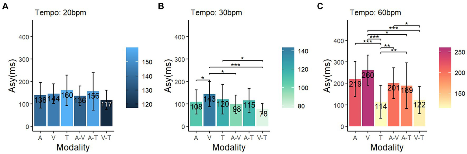 Comparison of asynchrony in each tempo condition. The blue, green, and red color schemes represent asynchrony at (A) 20 bpm, (B) 30 bpm, and (C) 60 bpm, respectively. The shading on the right side of each graph indicates the degree of asynchrony for the respective conditions (Asy, asynchrony; A, auditory; V, visual; T, tactile); *p < 0.05, **p < 0.01, ***p < 0.001.