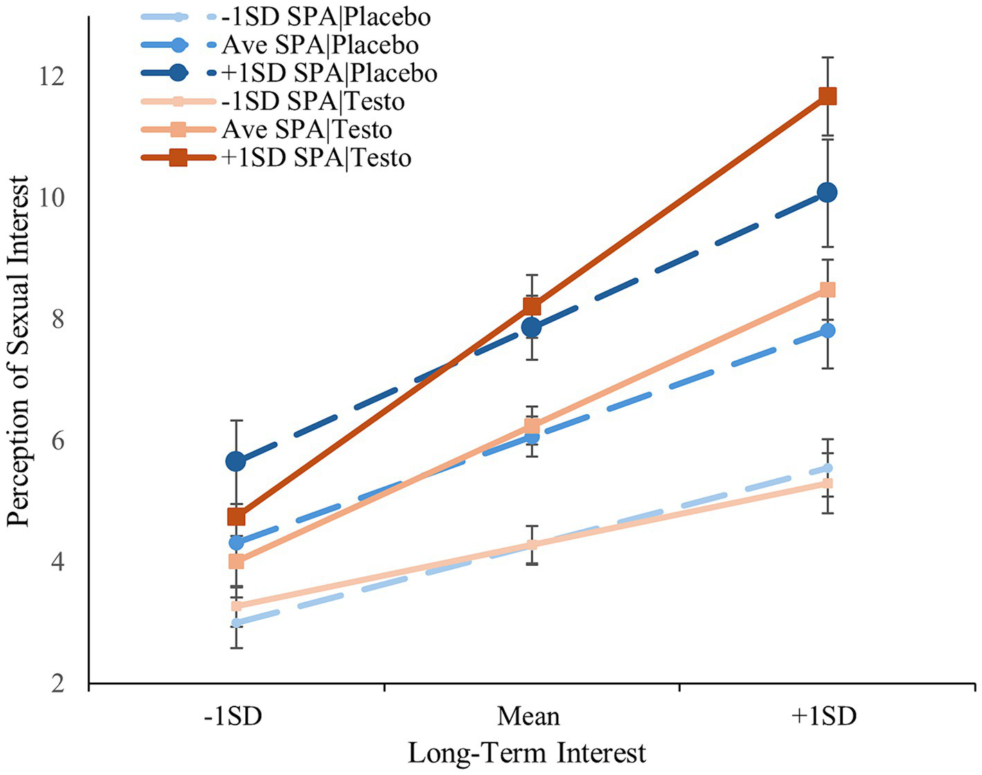 Men’s perception of sexual interest as a function of drug-treatment, self-perceived attractiveness, and their long-term interest. Error bars represent standard errors. SPA, self-perceived attractiveness.