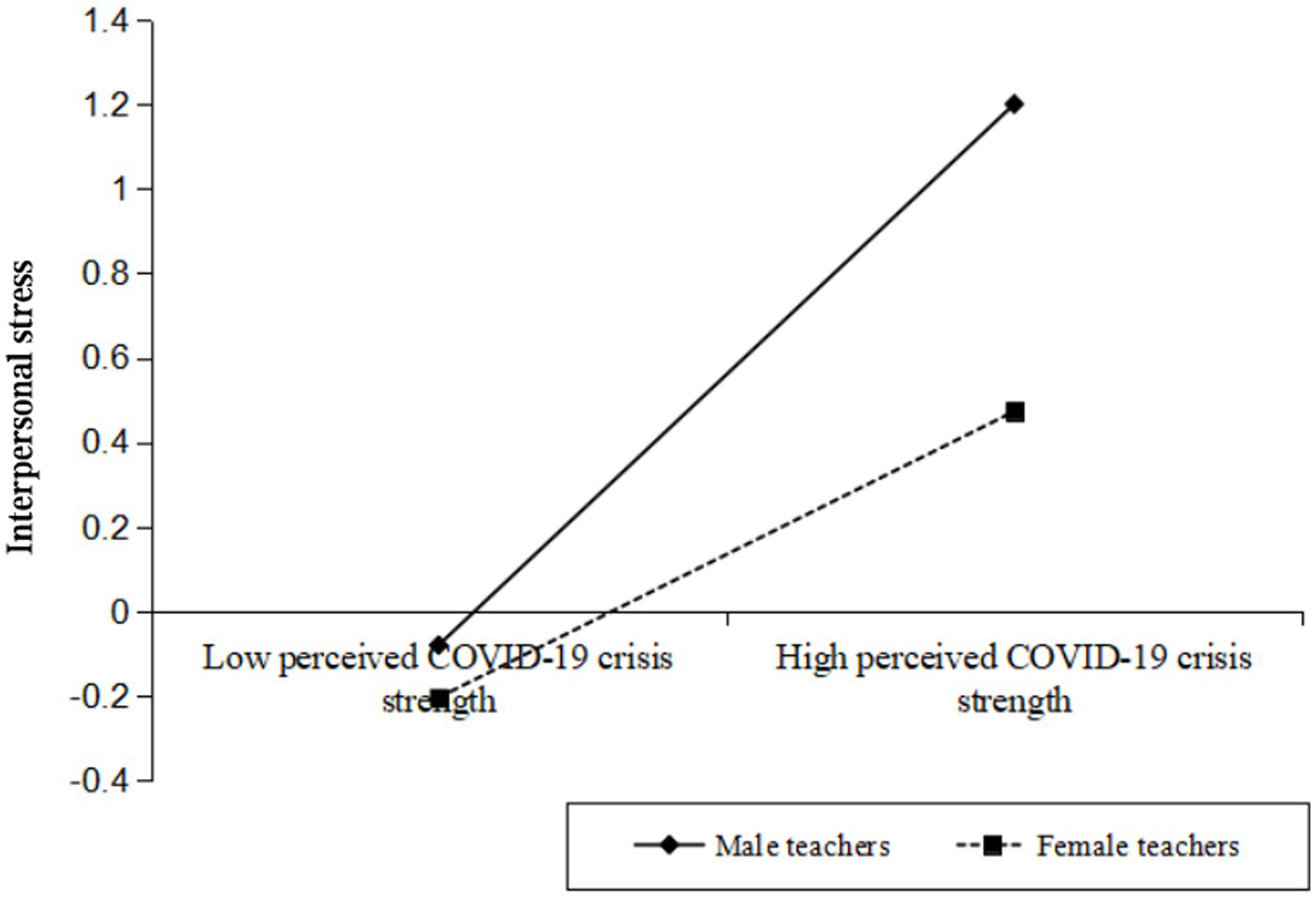Although significant relationship between COVID-19 pandemic and stress has been consistently identified in previous studies on teachers (Ozamiz-Etxebarria et al., 2021; Ma et al., 2022; Robinson et al., 2022), none of the studies have explored the moderating role of gender in the relationship between perceived COVID-19 crisis strength and teachers’ interpersonal stress in the workplace. As social cognitive theory posits that individuals’ behaviors (e.g., interpersonal stress) are influenced by the interaction of environmental (e.g., perceived COVID-19 crisis strength) and personal factors (e.g., gender) (Bandura, 2001). According to this theory, we proposed that gender may moderate the relationship between perceived COVID-19 crisis strength and teachers’ interpersonal stress, with the relationship being much stronger for male teachers than for female teachers. There are several reasons for this speculation. First, previous studies emphasized the role of gender differences in both COVID-19 pandemic-related stress (Alsharawy et al., 2020; Klapproth et al., 2020; Rinfret et al., 2022) and coping strategies used (Graves et al., 2021). Ample studies have shown that, compared to male teachers, female teachers experienced greater COVID-19 related stress (Klapproth et al., 2020; Stachteas and Stachteas, 2020; Oducado et al., 2021; Tharp et al., 2021). However, they tend to employ adaptive coping strategies, such as seeking social support, to copy with the stress, whereas men tend to resort to maladaptive coping strategies like denial in managing stressful situations (Dakhli et al., 2013; Alhija, 2015; Ferguson et al., 2017; Klapproth et al., 2020). Therefore, male teachers may report higher levels of interpersonal stress than female teachers in facing the COVID-19 epidemic.