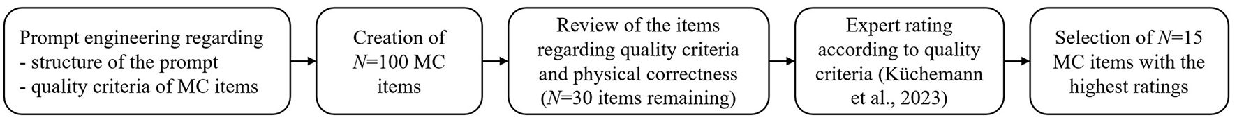 ChatGPT 3.5 was prompted to create items that target five subcategories of the FCI: kinematics (i.e., velocity and acceleration), Newton's first law, Newton's second law, Newton's third law, and the superposition. We applied a systematic sequence of items design using on ChatGPT consisting of the following five steps (Figure 1).
