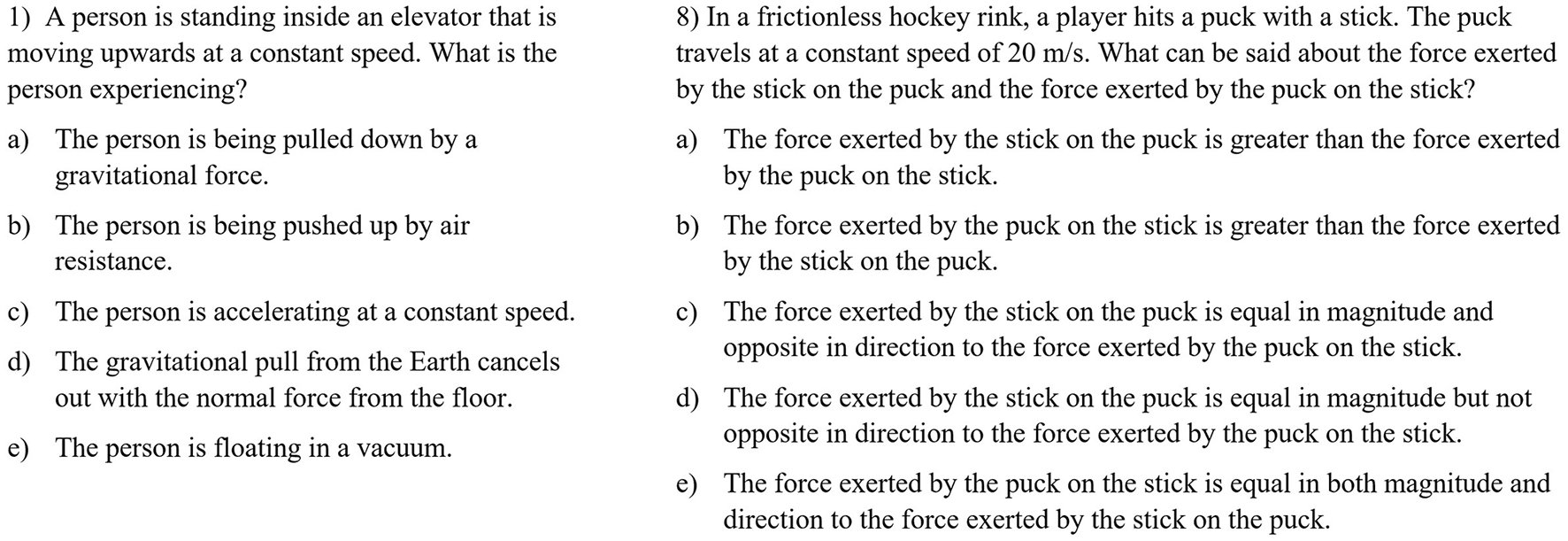 Two example items to assess Newton's 1st law (1) and Newton's 3rd law (8) created by ChatGPT.