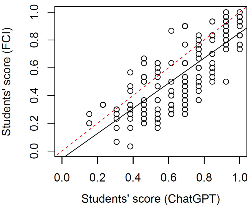 We analyzed the performance in the ChatGPT items and the FCI to understand how closely related the two sets of items are and how valid they are to map the concepts that are assessed in the FCI. Figure 4 shows the students' scores in both item sets. We found a significant linear regression with a slope of 0.70 (p < 10−10), Pearson's correlation coefficient r = 0.79), i.e., there is a very strong relation between the two set of items. Moreover, it is noticeable that over the whole range of students' scores, their performance in ChatGPT items is higher than their performance in FCI items. This means that for low, medium and high performers, ChatGPT items were easier than the FCI items.