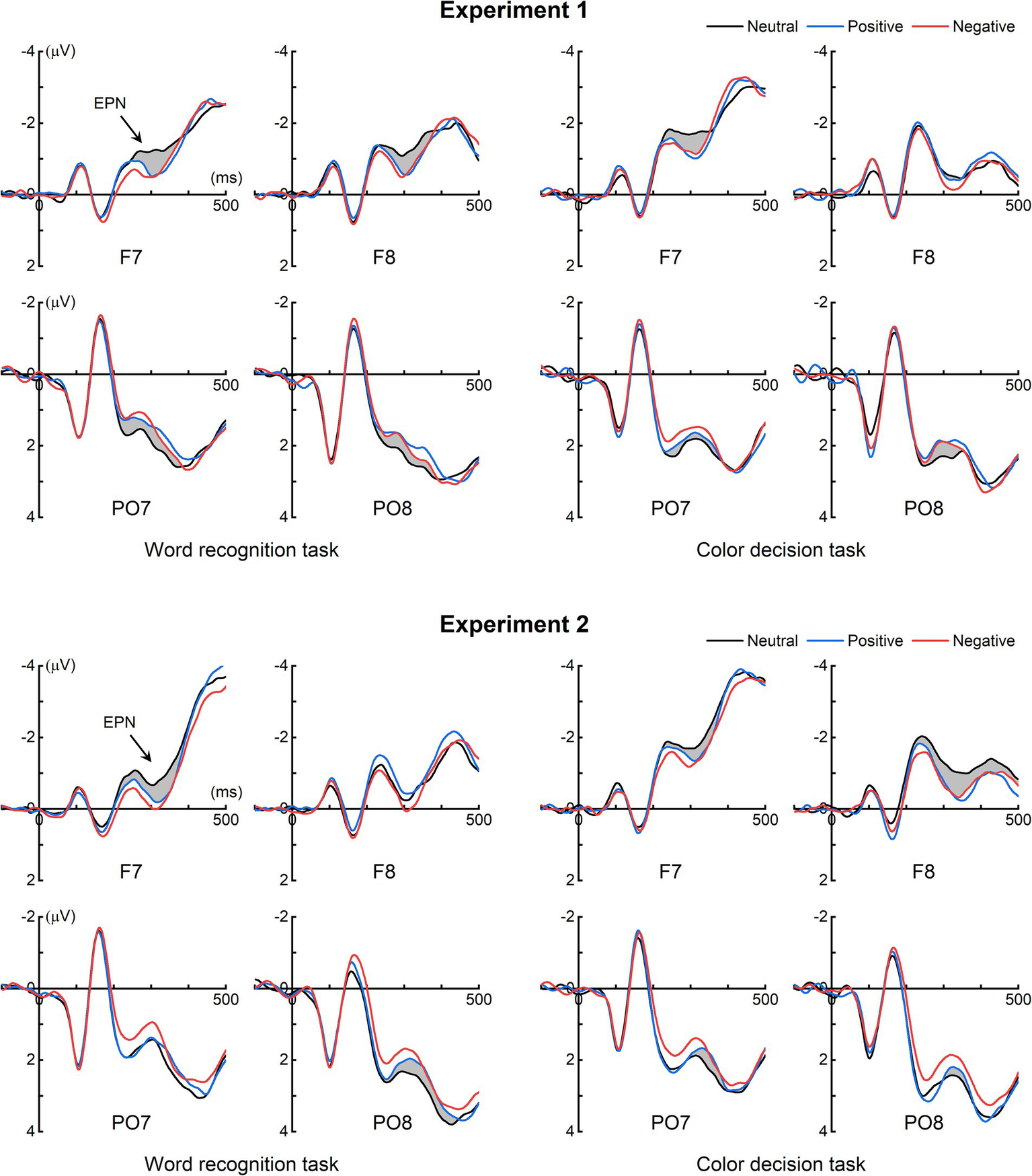 Figure 2 illustrates the grand-averaged ERPs for each task across both experiments. In Experiment 1, a visual inspection of the ERP waveforms reveals that emotional words, across both tasks, elicited more pronounced negative deflections compared to neutral words at posterior electrode sites (e.g., PO7 and PO8), and more pronounced positive deflections compared to neutral words in the frontal region (e.g., F7 and F8). This observed pattern closely corresponds to the topography of the EPN response to emotional stimuli (e.g., Kissler et al., 2007, 2009; Schacht and Sommer, 2009b; Bayer et al., 2012b; Chen et al., 2015). In contrast, for Experiment 2, the ERP difference between emotional and neutral words was notable in the frontal region (e.g., F7 and F8) but less pronounced at the posterior electrode sites (e.g., PO7 and PO8).