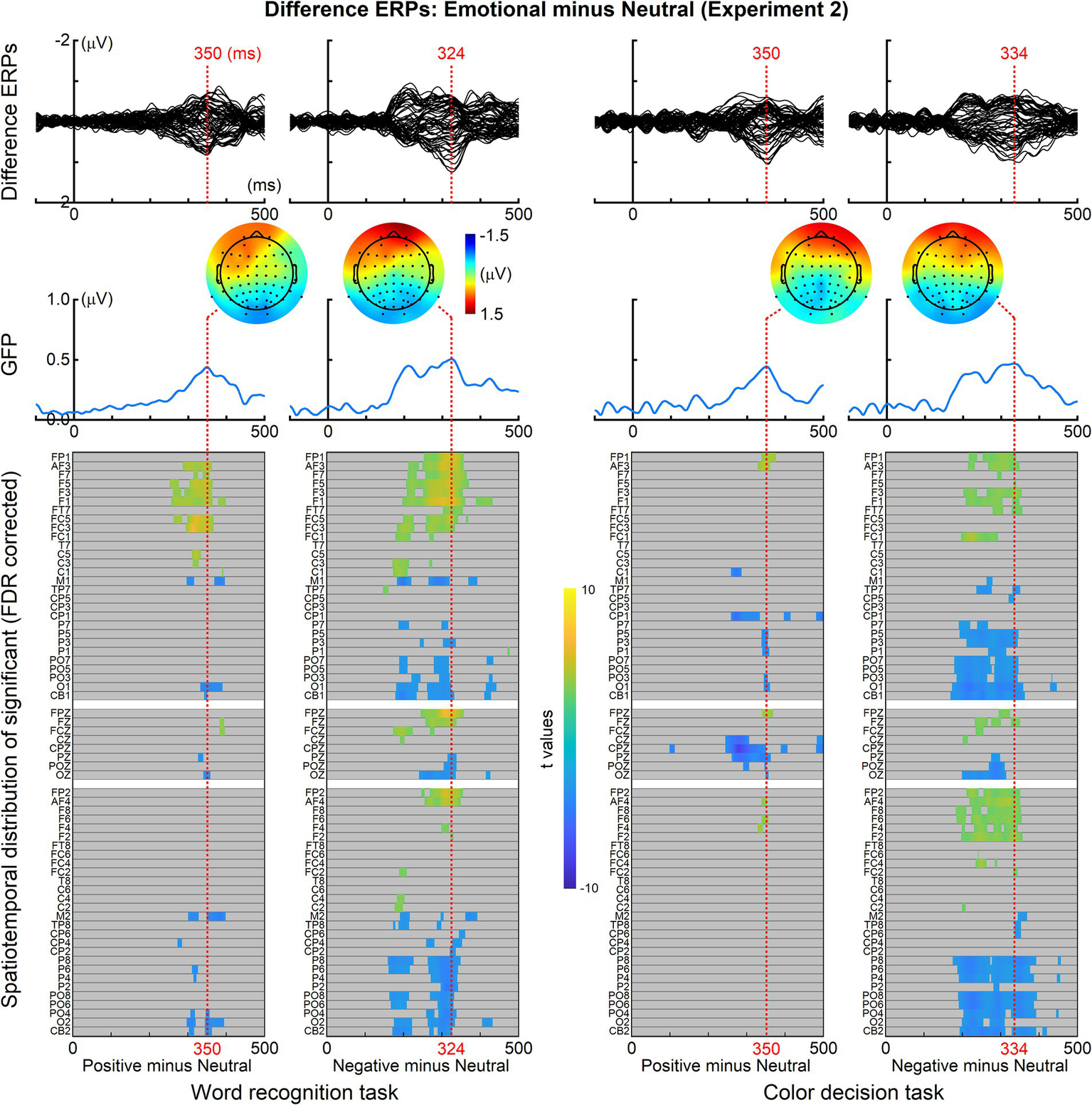 ERP differences between emotional and neutral words (Experiment 1). Top panels: grand-averaged difference ERPs across all 64 recording electrodes, obtained by subtracting ERPs elicited by neutral words from those elicited by emotional words. Middle panels: global field power (GFP) plots representing the computed GFP of the difference ERPs for each task. Bottom panels: spatiotemporal distribution of significant time points resulting from repeated-measures two-tailed t-tests conducted on ERPs elicited by emotional and neutral words at each electrode across time points from 50 to 500 ms.
