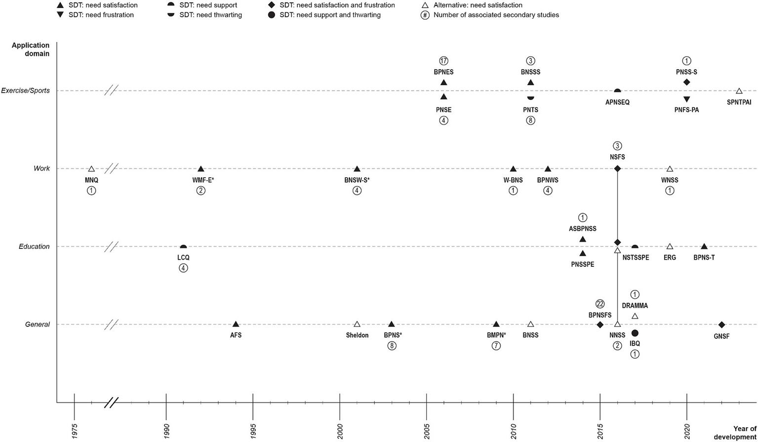 Chronological overview of the reviewed 31 original scales by domain, theoretical basis, and need fulfillment state. Slanted lines between the years 1975 and 1990 indicate a non-calibrated time gap; *related studies; AFS, Activity-feeling states scales; APNSEQ, Adolescent psychological need support in exercise questionnaire; ASBPNSS, Adolescent Students’ basic psychological needs at school scale; BMPN, Balanced measure of psychological needs scale; BNSS, Basic-needs-satisfaction scale; BNSSS, Basic needs satisfaction in sport scale; BNSW-S, Basic needs satisfaction at work scale; BPNES, Basic psychological needs in exercise scale; BPNS, Basic psychological needs scale; BPNSFS, Basic psychological need satisfaction and frustration scale; BPNS-T, Basic psychological needs scale for teachers; BPNWS, Basic psychological needs at work scale; DRAMMA, DRAMMA questionnaire; ERG, Existence, relatedness, and growth needs scale; GNSF, General need satisfaction and frustration scale; IBQ, Interpersonal behaviors questionnaire; LCQ, Learning climate questionnaire; MNQ, Manifest needs questionnaire; NNSS, Novelty need satisfaction scale; NSFS, Need satisfaction and frustration scale - educational and work contexts; NSTSSPE, Need-supportive teaching style scale in physical education; PNFS-PA, Psychological need frustration scale for physical activity; PNSE, Psychological need satisfaction in exercise scale; PNSSPE, Psychological needs satisfaction scale in physical education; PNSS-S, Psychological need states in sport-scale; PNTS, Psychological need thwarting scale; SPNTPAI, Satisfaction of psychological needs through physical activity instrument; Sheldon, “Sheldon scale”; W-BNS, Work-related basic need satisfaction scale; WMF-E, Work Motivation form-employee; WNSS, Work needs satisfaction scales.