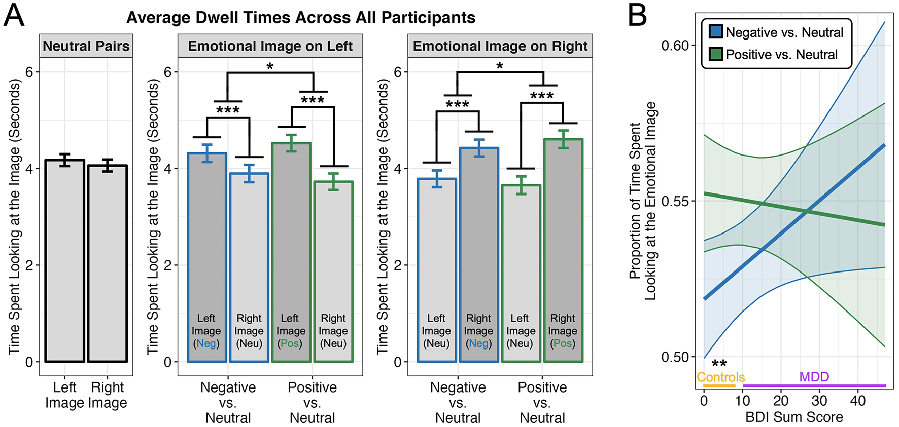 Figure 2. Dwell times on images as a function of emotion. (A) Overall, participants (n = 72) spent more time looking at the emotional than the neutral images in each pair, irrespective of spatial location (left or right). We also observed a significant interaction of image emotion and pair condition due to a stronger differential attentional bias toward positive images in the positive–neutral pairs relative to the attentional bias toward negative images in the negative–neutral pairs (middle and right panels). No difference in dwell time was observed as a function of spatial location for neutral-neutral image pairs (left panel). (B) Regression with Beck Depression Inventory (BDI) sum scores revealed that only participants with lower depressive symptoms exhibited a stronger attentional bias for positive–neutral pairs than negative–neutral pairs. On the x-axis, the range of BDI scores for individuals diagnosed with Major Depressive Disorder (MDD) are indicated in purple while those for healthy controls are indicated in orange. All plots depict estimated marginal means from the linear mixed effects model and 95% confidence intervals/bands. *p < 0.05, **p < 0.01, ***p < 0.001.