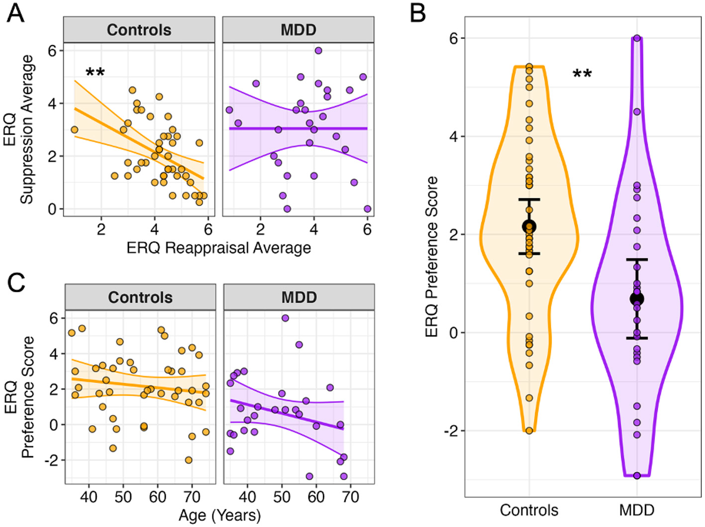 Figure 3. Emotion regulation strategy preferences in healthy and depressed individuals. (A) Reappraisal use is negatively associated with suppression use in healthy controls, but not MDD participants. (B) Healthy controls exhibit a general preference for reappraisal use, while MDD participants exhibit no preference for either strategy (ERQ preference score = reappraisal average – suppression average). (C) For both groups, age was not significantly associated with an ERQ preference for reappraisal or suppression. Plots depict averages for each participant and 95% confidence intervals/bands. **p < 0.01.
