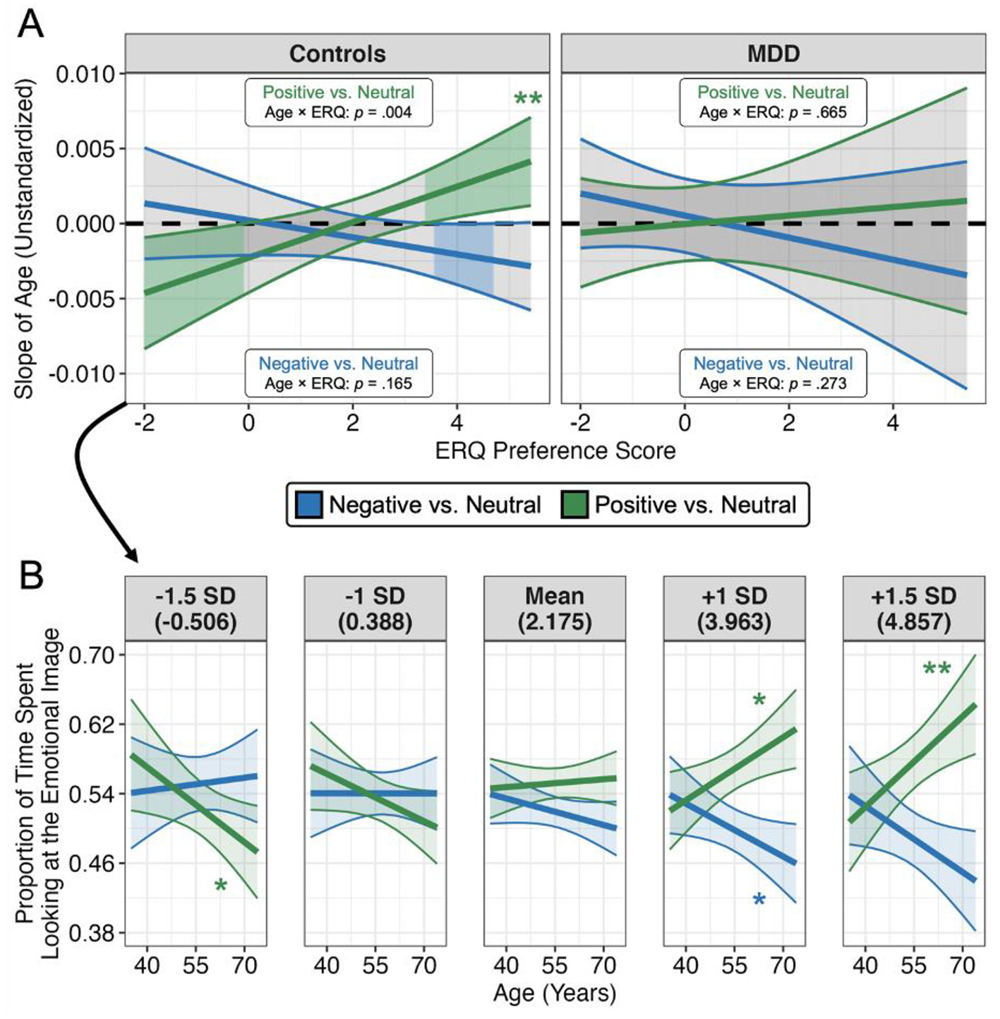 Figure 4. Emotion regulation style moderates age-related positivity biases in non-depressed individuals. (A) The relationship between age and dwell times (y-axis) shifts based on ERQ preference scores (x-axis). Regions where the regression line and confidence band do not cross zero indicate a significant (p < 0.05) slope of age. As ERQ preference score increases (more preference for using reappraisal than suppression), the relationship between age and dwell times becomes more positive for positive images, and more negative for negative images, but only in healthy controls. (B) The relationship between age and dwell times at specific levels of ERQ preference, only for healthy controls. Values in parentheses indicate the raw ERQ preference score at each level from −1.5 to +1.5 SD (standardized within controls). Both plots depict estimated marginal trends computed from the higher-level linear mixed effects model and 95% confidence intervals/bands. *p < 0.05, **p < 0.01.