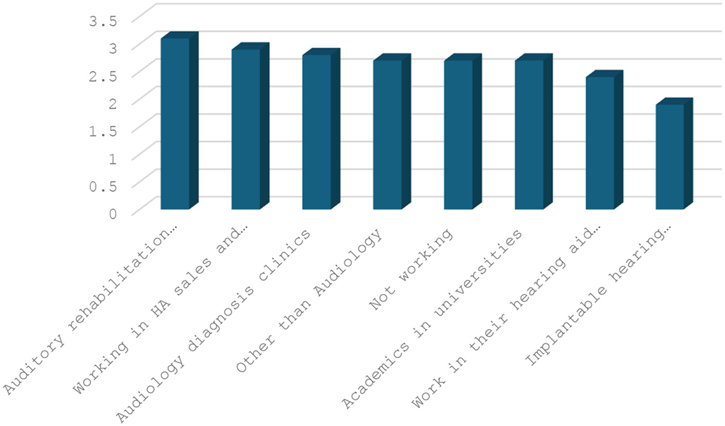 Out of all participants, 9% (n = 15) stated that they run their hearing aid center, while 34.1% (n = 57) worked in the hearing aid sales and application center. In addition, 4.2% (n = 7) worked in the auditory implant companies, 11.4% (n = 19) worked in Audiology diagnosis clinics in a private or public hospitals, 12% (n = 20) worked as academicians in the audiology department of universities, and 16.8% (n = 28) worked in auditory rehabilitation centers. Additionally, 11 (6.6%) reported working in a specialist in different fields, while 10 (6%) reported not working in any professional (Table 2).