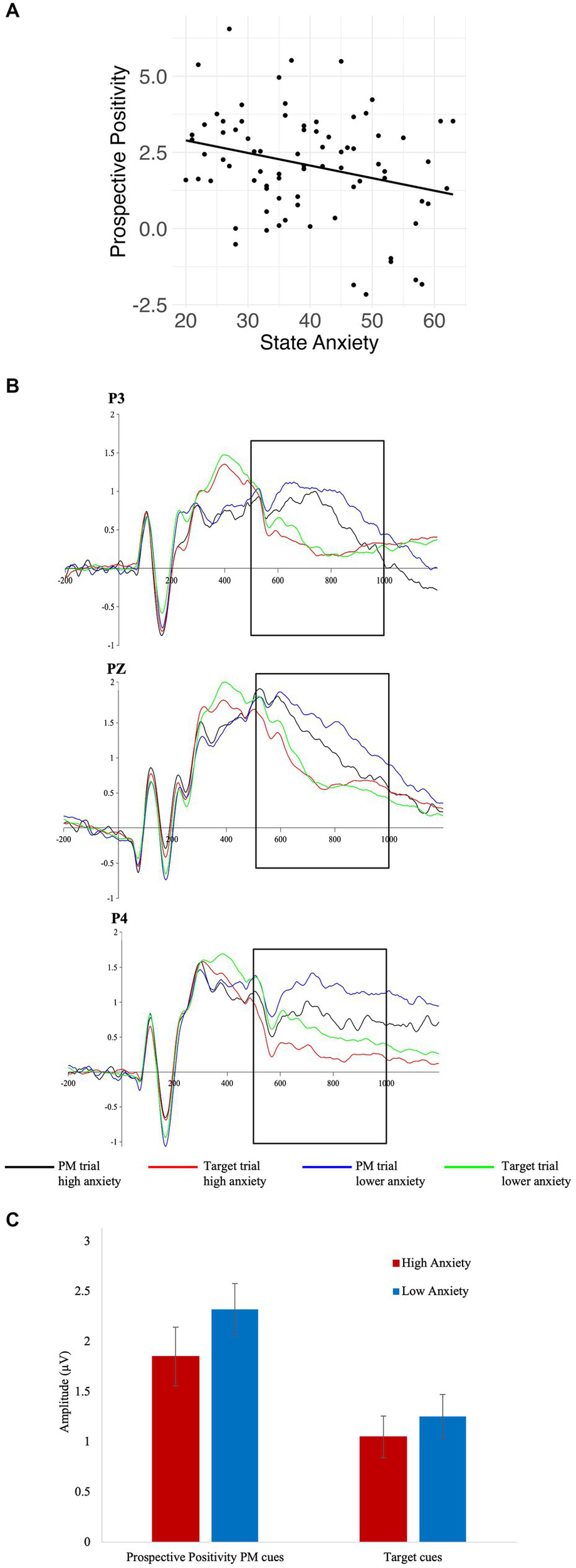Almost all research has examined the role of anxiety in PM without separating cue detection and intention retrieval, but Arnold et al. (2015) used multinomial processing tree modeling to investigate how state and trait anxiety relate to the two components of PM. They observed a negative correlation between state anxiety and PM accuracy, as well as a negative relationship between state anxiety and cue detection (Arnold et al., 2015). These results suggested that cue detection may be a particularly sensitive component of PM for college students with high levels of state anxiety. To date, there are no studies that have implemented neurophysiology to examine similar aims. Researchers can measure ERPs during a PM task to investigate the neural processes underlying the two components of PM (Chen et al., 2015). By utilizing ERPs, the current study extends upon previous behavioral findings by examining neural correlates associated with the two components of PM in college students with anxiety.