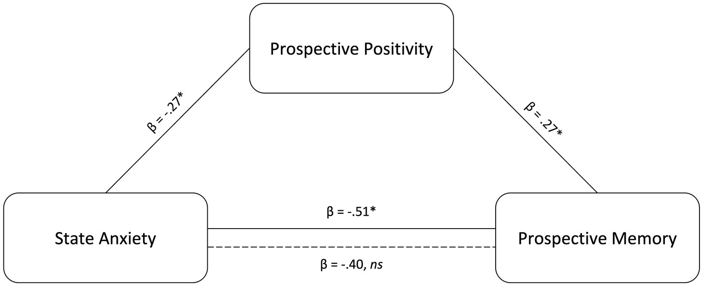 The results demonstrated that, when controlling for age and gender, higher state anxiety was significantly associated with lower PM accuracy (β = −0.27, p = 0.020) and lower prospective positivity amplitude (β = −0.04, p = 0.021). Lower prospective positivity amplitude was significantly associated with lower PM accuracy (β = 0.27, p = 0.015). Higher state anxiety was significantly indirectly associated with lower PM accuracy mediated by lower prospective positivity amplitude (ab = −0.11, p = 0.047).