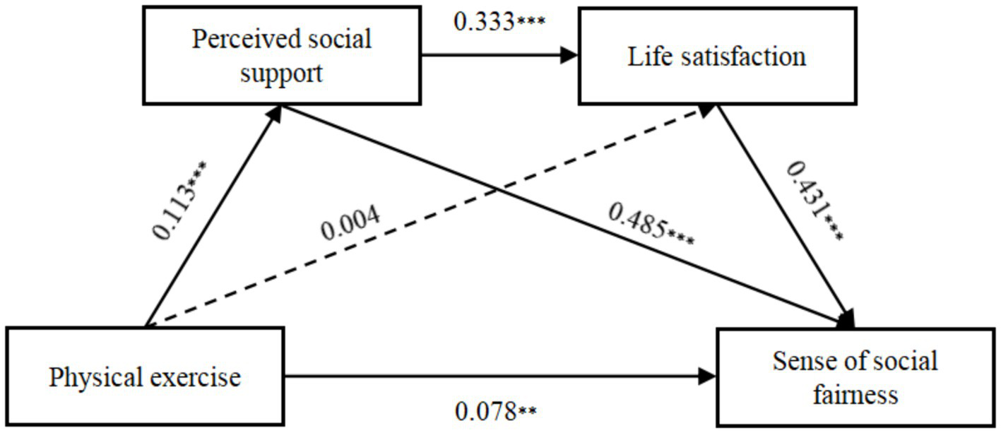The main effect theory of social support suggests that an individual’s engagement with social resources significantly impacts their sense of purpose, belonging, and self-worth (Malecki and Demary, 2002). High levels of social support are seen as essential resources that foster individual development (Chen et al., 2018) and are linked to greater life satisfaction (Yang and Ye, 2014). Furthermore, the theory of embodied cognition posits that physical activities promote interactions that trigger specific mental states through sensory and motor system pathways (Yang et al., 2009). Research also indicates that individuals with robust social support perceive their organizations as just (Deconinck, 2010), and a strong belief in a just world correlates with higher life satisfaction (Kamble and Dalbert, 2012). Based on these insights, this study introduces Hypothesis 4: Perceived social support and life satisfaction sequentially mediate the relationship between physical exercise and the sense of social fairness among college students.