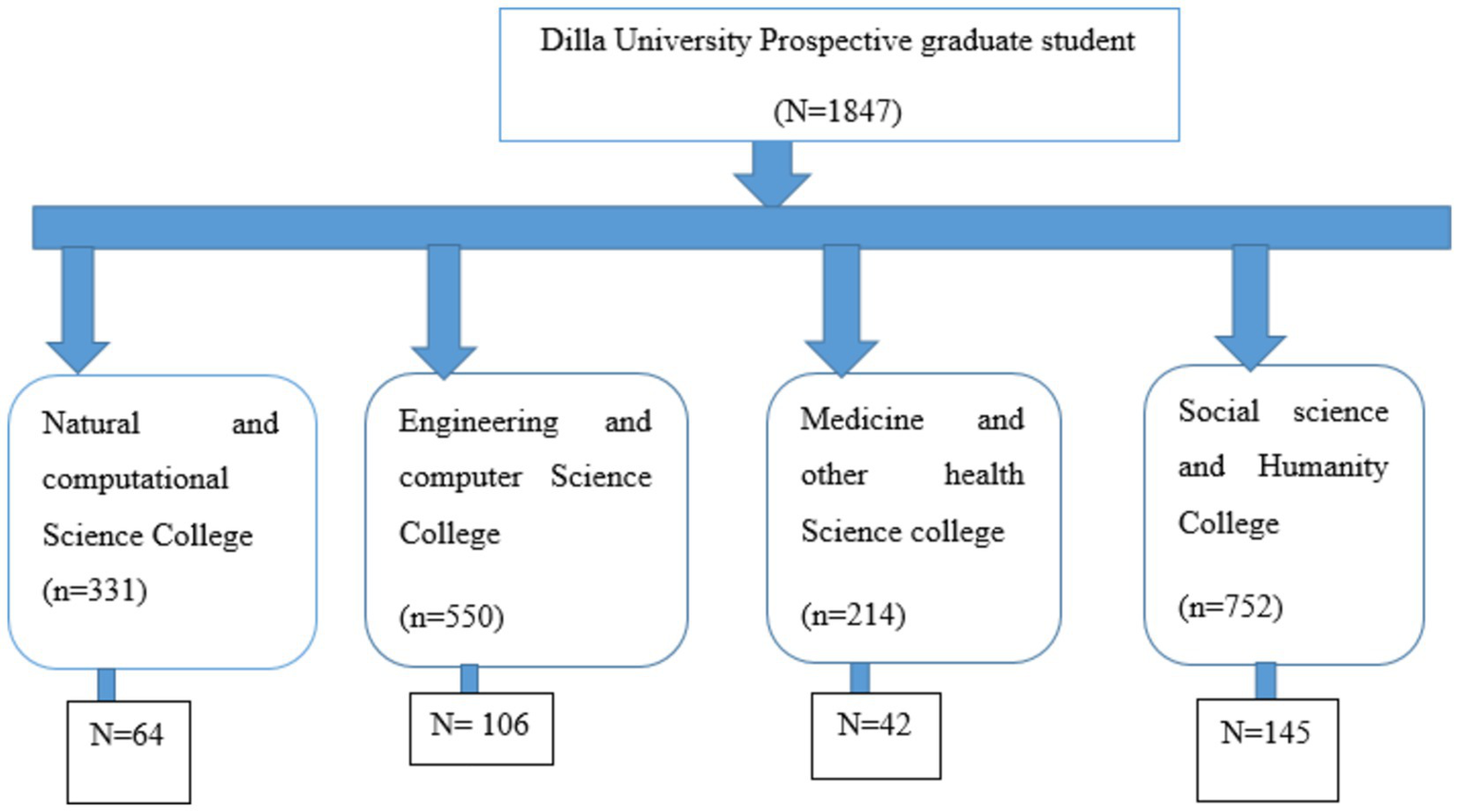 The study utilized a systematic random sampling technique to select participants. Dilla University’s annual reports indicate approximately 1847 prospective graduates across its colleges: Natural and Computational Science (n = 331), Engineering and Computer Science (n = 550), Medicine and Other Health Science (n = 214), and Social and Humanities College (n = 752). Systematic random sampling was employed to select individual samples. The kth interval was determined by dividing the total student size in each college by the total sample size, where N represents the total number of students in each college, and n denotes the total sample size. Participants were selected using the systematic random sampling technique at regular kth intervals during the data collection period. The study involved a proportional allocation of study participants across the four colleges. To calculate the Kth Interval, we used N/n = 1847/421 = 4th (Figure 1).