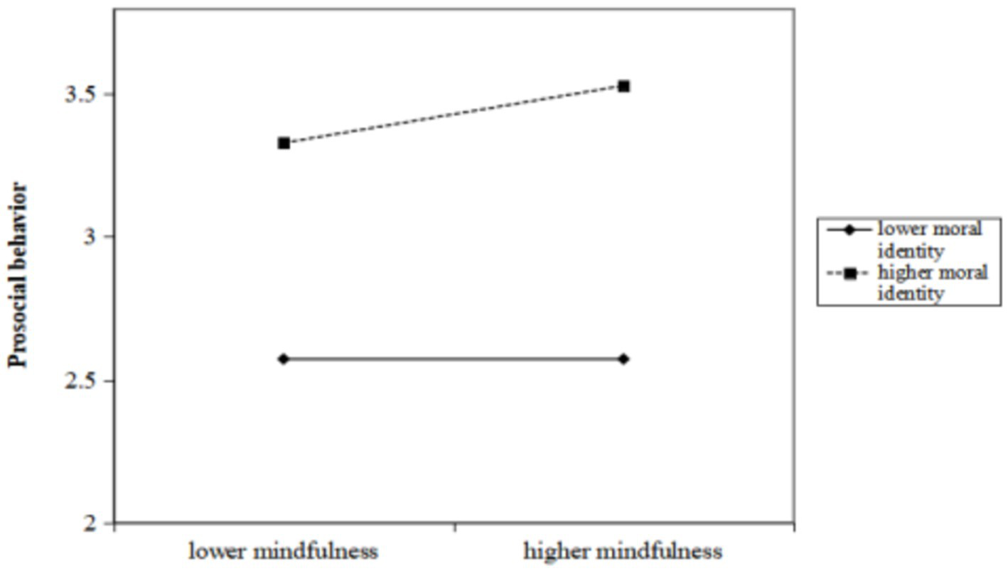 Moral identity is commonly used as an individual characteristic to delineate variations among individuals. Several studies have indicated that moral identity plays a moderating role in the relationships between several psychological factors and prosocial behavior. For example, the mindfulness-prosociality association among undergraduate students with higher or lower levels of ethical dispositions showed that trait mindfulness was more strongly associated with prosociality among lower relative to higher ethical individuals (Guo et al., 2021). However, another study suggested that compared to individuals with low moral identity, those with high moral identity exhibit a stronger correlation between moral elevation and prosocial behavior (Wan et al., 2023). Individuals with higher levels of moral identity exhibit a strong desire to align their moral identity with their actual behavior. They place greater emphasis on the significance of moral character and tend to uphold their internal moral standards, which reduces the likelihood of moral disengagement and enhances the probability of engaging in prosocial behavior (Zhao and Qu, 2022). Individuals with low moral identity have diminished moral self-control and tend to disregard the effects of internal moral traits. Consequently, moral decision-making is more contingent on external perceptions (Moore et al., 2019). These above findings suggest that the role of moral identity in the relationship between mindfulness and prosocial behavior is worthy of further exploration.