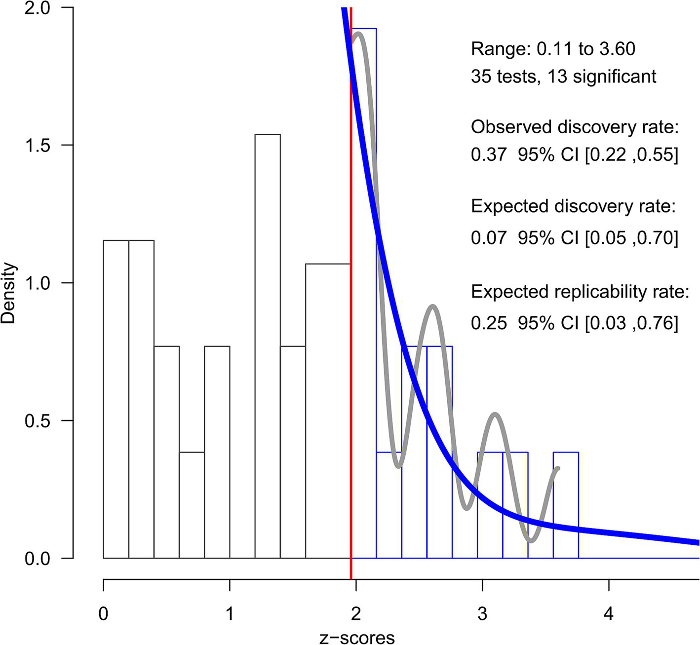 Figure 4. Z-curve analysis. The figure shows the results of the Z-curve analysis of the included effects converted into z-scores. The histogram displays the distribution of observed z-scores from the 35 effects included, with 13 being statistically significant (z > 1.96, indicated by the red vertical line). The grey line represents the observed density of the significant z-scores, while the solid blue line depicts the fitted z-curve model.