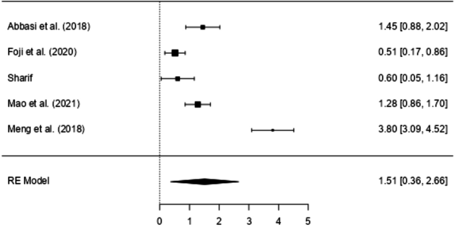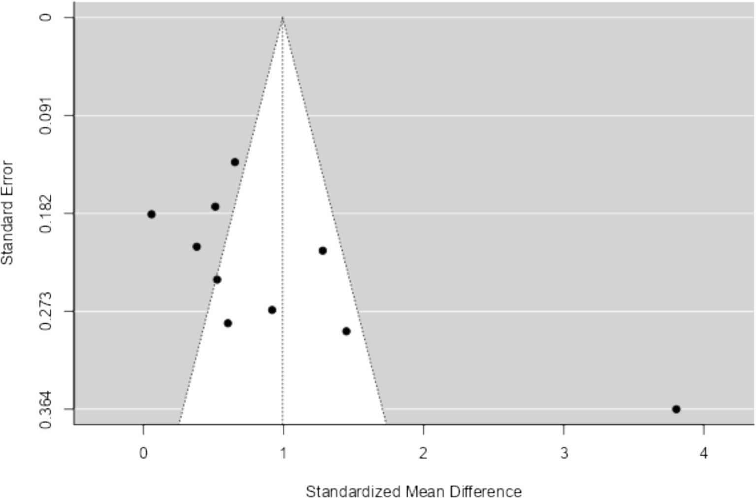 The results of Funnel Plot Analyses examining the intervention effect on EI are presented in Figure 4. Following the recommendation by Higgins et al. (2011) for a minimum of ten studies to investigate small study effects or publication bias, all ten available studies were pooled together for this analysis. Both the visual inspection of the figure and Egger’s regression test indicated funnel plot asymmetry (p < 0.05), suggesting the presence of potential bias. Notably, one study (Meng and Qi, 2018) appeared to be particularly influential and emerged as an outlier in this analysis. The results of the overall Random Effects Model (n = 10) can be found in Table 6 and Figure 5.