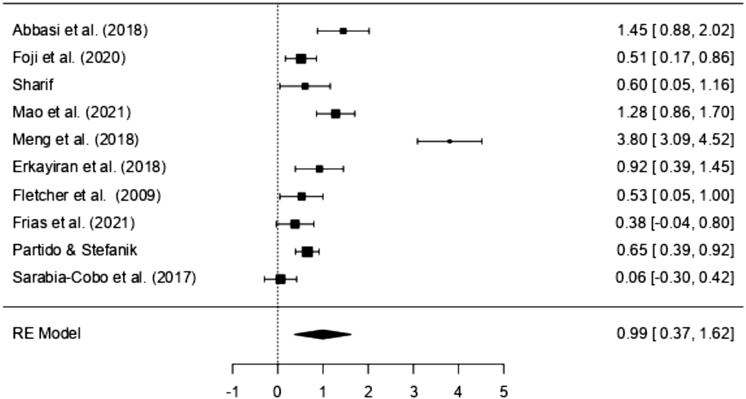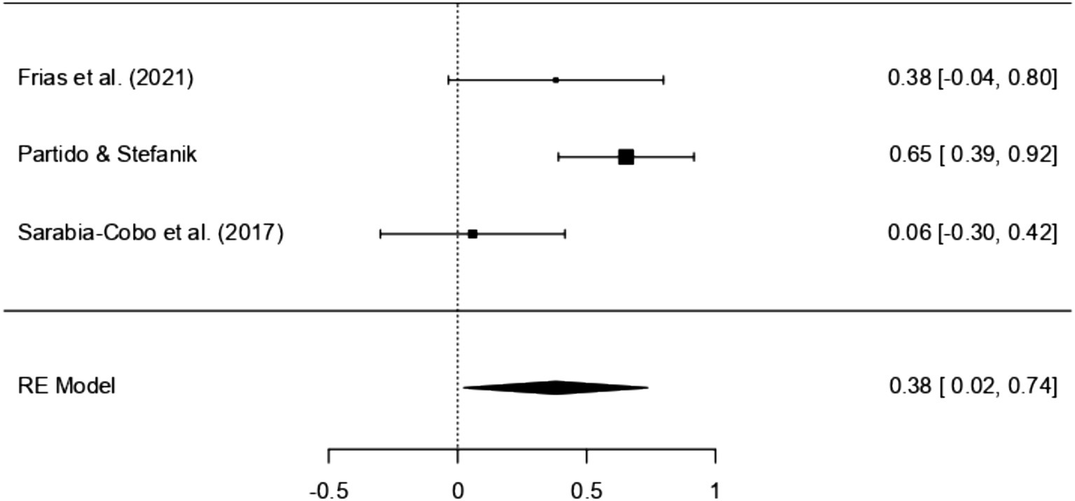 In the case of non-RCT studies, three studies were included in the meta-review (Frias et al., 2021; Partido and Stefanik, 2020; Sarabia-Cobo et al., 2017). The SMD within these studies ranged from 0.06 to 0.65. Interestingly, all three studies concurred in reporting a noticeable increase in EI as a result of the intervention. However, it is essential to highlight that most of these studies indicated a small effect size (n = 2), besides the study conducted by Partido and Stefanik (2020) which was found to have a moderate effect size (SMD = 0.65).