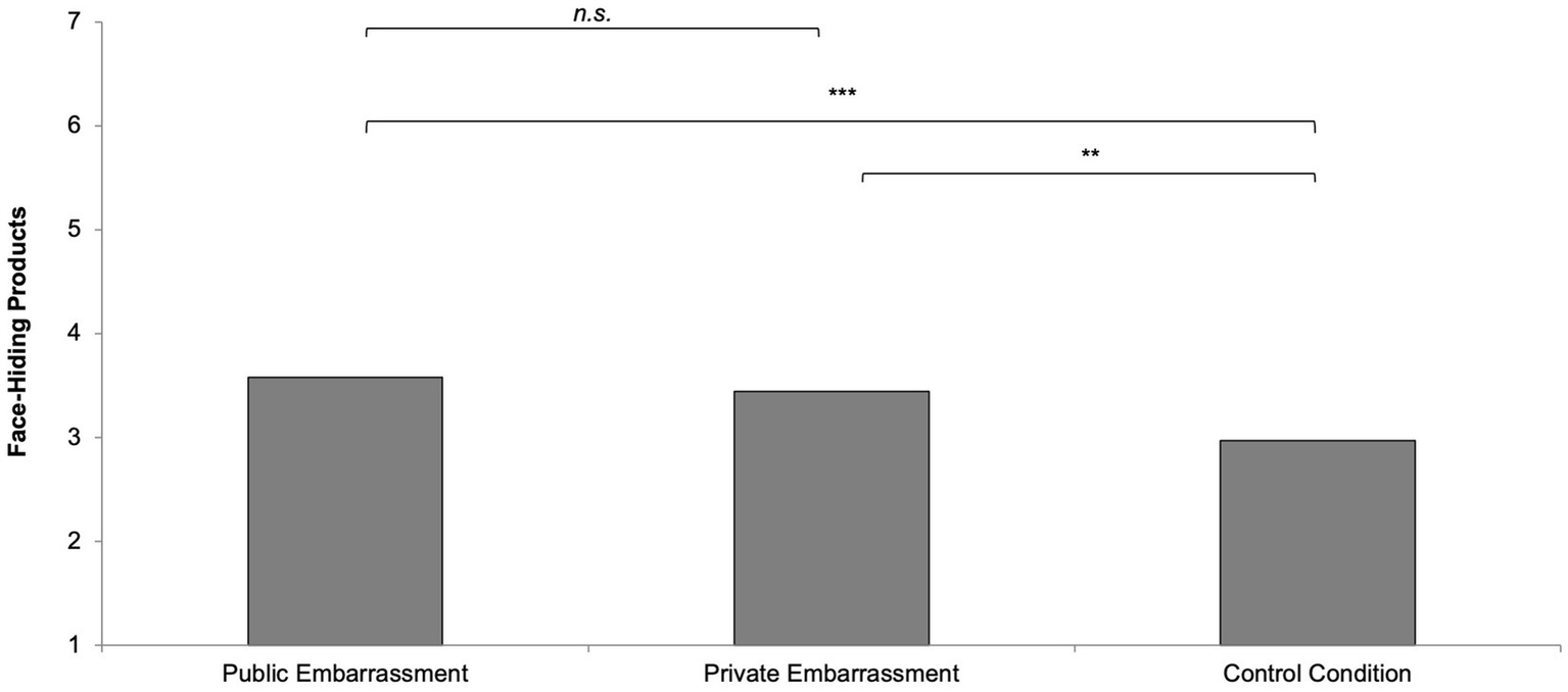 An ANOVA with the three groups (private embarrassment vs. public embarrassment vs. control group) as independent variable and face-hiding tendency as the dependent variable showed a significant effect, F(2,166) = 3.17, p = 0.044, η2 = 0.04. Contrast analyses revealed that the public embarrassment group had a similar face-hiding tendency (M = 2.54, SD = 1.12) to the private embarrassment group (M = 2.38, SD = 1.16), t(166) = 0.66, p = 0.509, but more compared to the control condition (M = 2.07, SD = 1.00), t(166) = 2.43, p = 0.016. The private embarrassment group did not significantly differ from the control condition, t(166) = 1.51, p = 0.134.