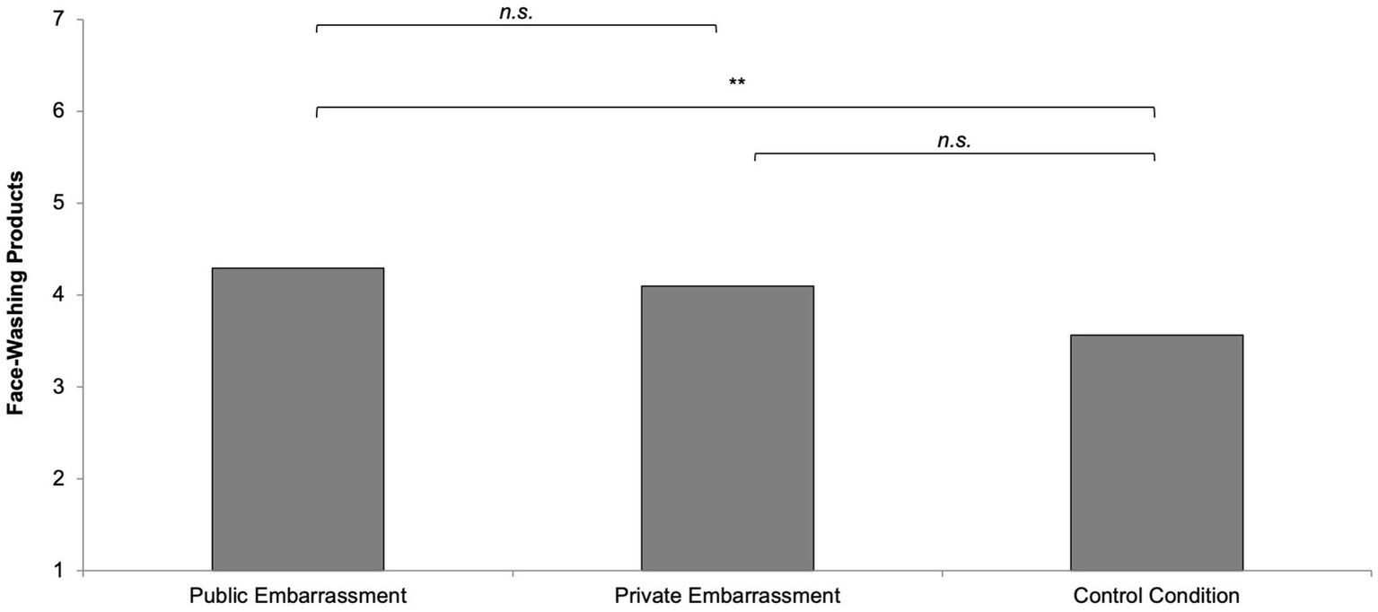 The preference for face-washing products marginally differed, F(2,166) = 3.01, p = 0.052, η2 = 0.04. The public embarrassment group had a similar preference for face-washing products (M = 4.29, SD = 1.91) compared to the private embarrassment group (M = 4.10, SD = 1.77), t(166) = 0.50, p = 0.615, but more compared to the control condition (M = 3.56, SD = 1.61), t(166) = 2.32, p = 0.022. The private embarrassment group did not differ from the control group, t(166) = 1.58, p = 0.116 (Figure 4).