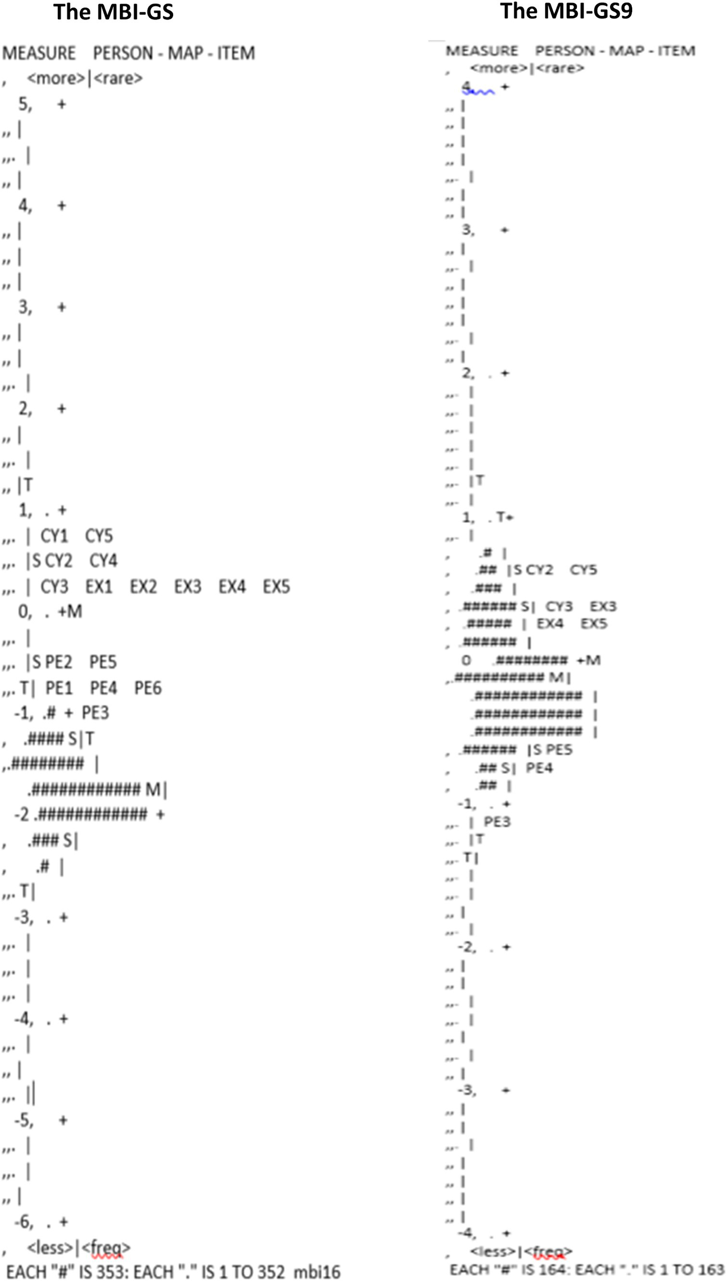 Figure 2 shows the Wright maps for the MBI-GS and the MBI-GS9. The left side of the map showed the distribution of respondents in the sample arranged along a hierarchy by person burnout. The right side of the map showed the array of items ordered by item endorsability. Persons at the top have the highest level of burnout, and items at the top of the map are the most unlikely to endorse (Lozano Rojas et al., 2009). Both the MBI-GS and the MBI-GS9 showed clear item difficulty hierarchy on the right side. For the MBI-GS9, the person mean was near the item mean, and item distribution covered the range of person distribution. Therefore, the MBI-GS9 had a sufficient number of items to measure persons at all possible lowest and highest scores and can precisely differentiate between persons who were near the mean score, better than the MBI-GS.