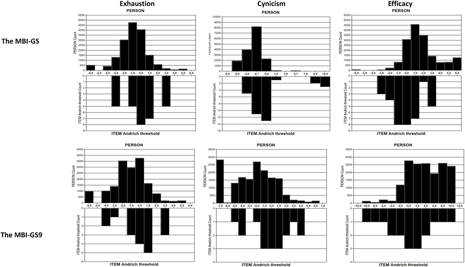 Figure 3 shows the spread of person-item locations in three subscales. In the MBI-GS9, the ranges of item thresholds (the lower half) generally covered the ranges of the measured constructs (the upper half). Only a few extreme lowest values in Exhaustion and Cynicism were below the sensitivity that could be captured by the MBI-GS9. In the MBI-GS, the ranges of item thresholds covered the ranges of the measured constructs regarding exhaustion and cynicism, but for efficacy in the MBI-GS, the spread of persons with high values exceeded the right side of the item range, indicating a ceiling effect. Overall, items in the MBI-GS9 better fit the measured construct (burnout in this study) than the MBI-GS, providing a more precise assessment.