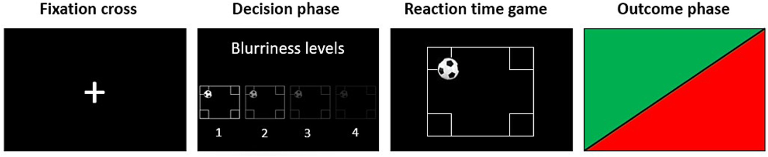 A visual description of the paradigm is presented in Figure 1. In each trial, participants were first presented with a fixation cross, then they were asked to choose the level of screen blurriness for the opponent within 5 s (decision phase). The levels available ranged from 1 (normal screen) to 4 (maximum blurriness) and there was no limit to the number of times each level could be selected. Examples of how the screen of the opponent would look like in the four different blurriness conditions were presented before the beginning of the task in some instruction trials and always available during the decision phase. After the decision phase, participants were presented with another fixation cross which preceded the reaction time task, in which participants were instructed to press a button as fast as possible when a ball bounced against any of the four corners at the borders of the screen. The game was followed by the outcome phase, in which a flash of green or red light, respectively, indicated that participants won or lost the game (outcome phase).