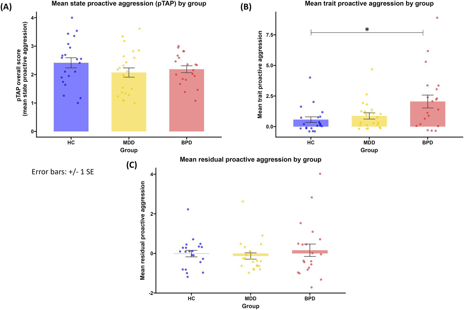 Figure 2. (A) mean state proactive aggression by group; (B) mean trait proactive aggression (scores in the proactive aggression subscale of the RPQ) by group; (C) mean residual proactive aggression (standardized residuals of the proactive aggression subscale of the RPQ) by group. HC, healthy controls; MDD, major depressive disorder, BPD: borderline personality disorder. *p < 0.05.
