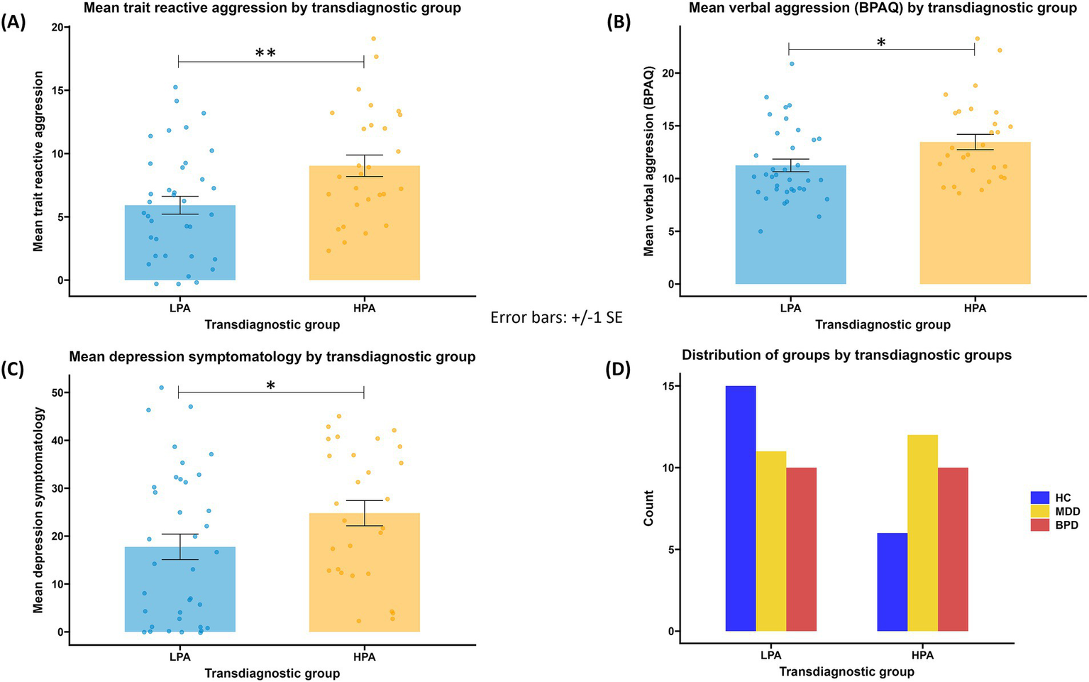 Figure 3. (A) mean trait reactive aggression (scores in the reactive aggression subscale of the RPQ) by transdiagnostic group; (B) mean verbal aggression (scores in the verbal aggression subscale of the BPAQ) by transdiagnostic group; (C) mean depression symptomatology (depression scores in the BDI-II) by transdiagnostic group; (D) composition of the LPA and HPA groups regarding the diagnostic groups (HC, healthy controls; MDD, major depressive disorder, BPD: borderline personality disorder). LPA: low proactive aggression group; HPA, high proactive aggression group. *p < 0.05; **p < 0.01.