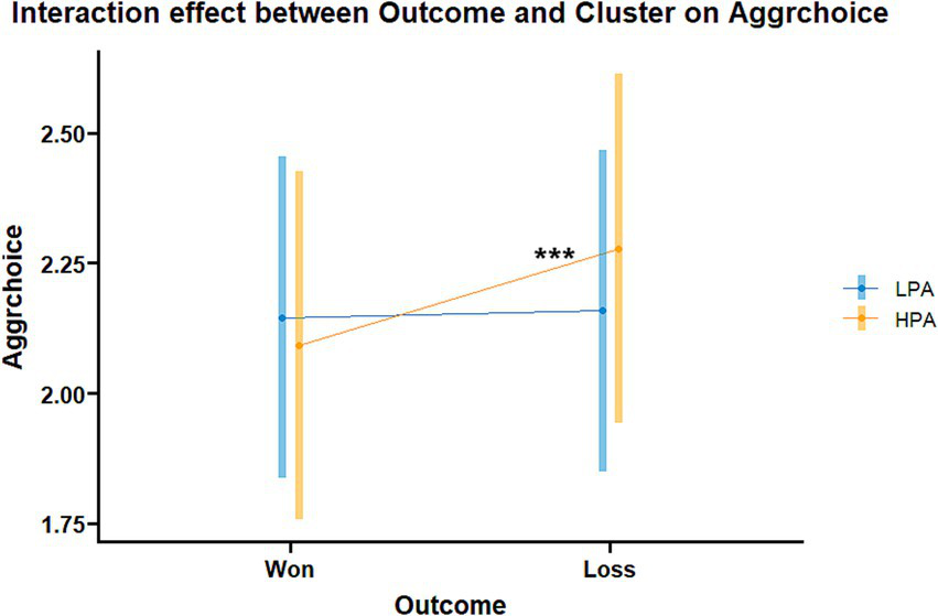 Figure 4. Interaction effect between Outcome and Cluster in the aggression choice model in the transdiagnostic groups (Model 3). Aggrchoice: state proactive aggression; LPA, low proactive aggression group; HPA, high proactive aggression group. ***p < 0.001.