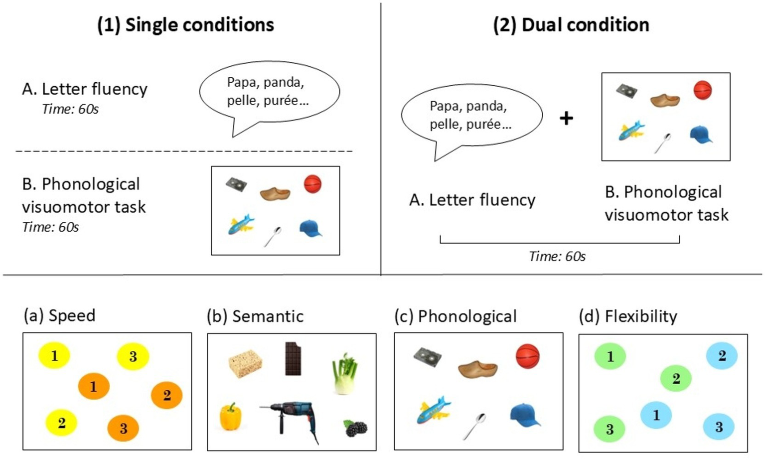 Top of the figure: Illustration of the dual-task paradigm procedure with examples of the letter “P” fluency and the phonological interference: (1) single conditions: (A) letter fluency alone [leading to the production of the words “papa, panda, pelle, purée…” (dad, panda, shovel, mashed potatoes…)] and (B) phonological visuomotor interfering task alone and (2) dual condition: letter fluency and phonological visuomotor interfering task simultaneously (A + B). Bottom of the figure: Illustrations of items from the four visuomotor interfering tasks: (a) speed (circle yellow numbers in ascending order), (b) semantic (circle vegetables, e.g., pepper and tools, e.g., drill), (c) phonological [circle words ending with [Ꜫt] e.g., “casquette” (cap) or [ɔ̃], e.g., “avion” (plane)], and (d) flexibility (circle numbers in ascending order and alternating colors, e.g., 1 green, 2 blue, 3 green…).