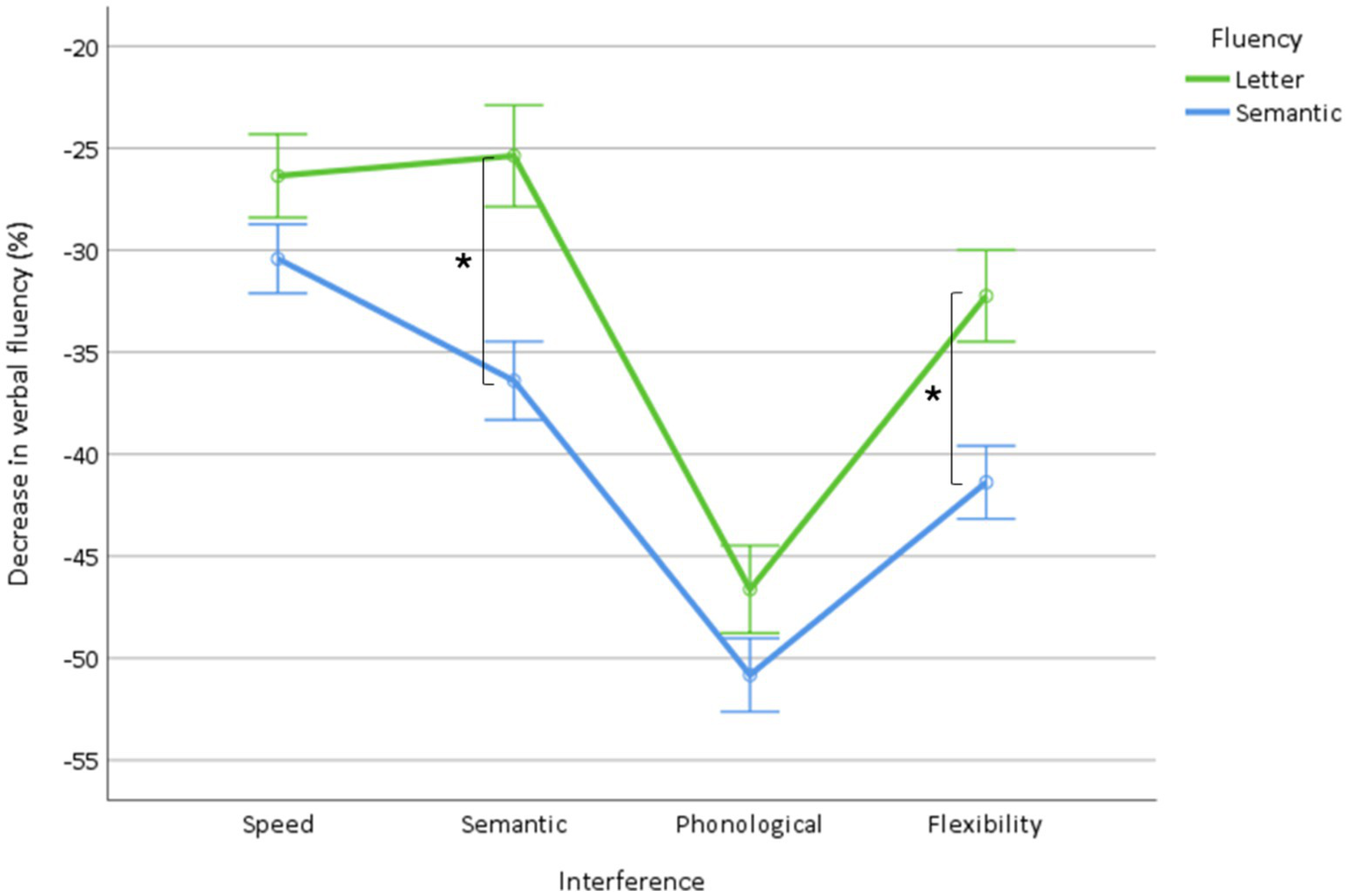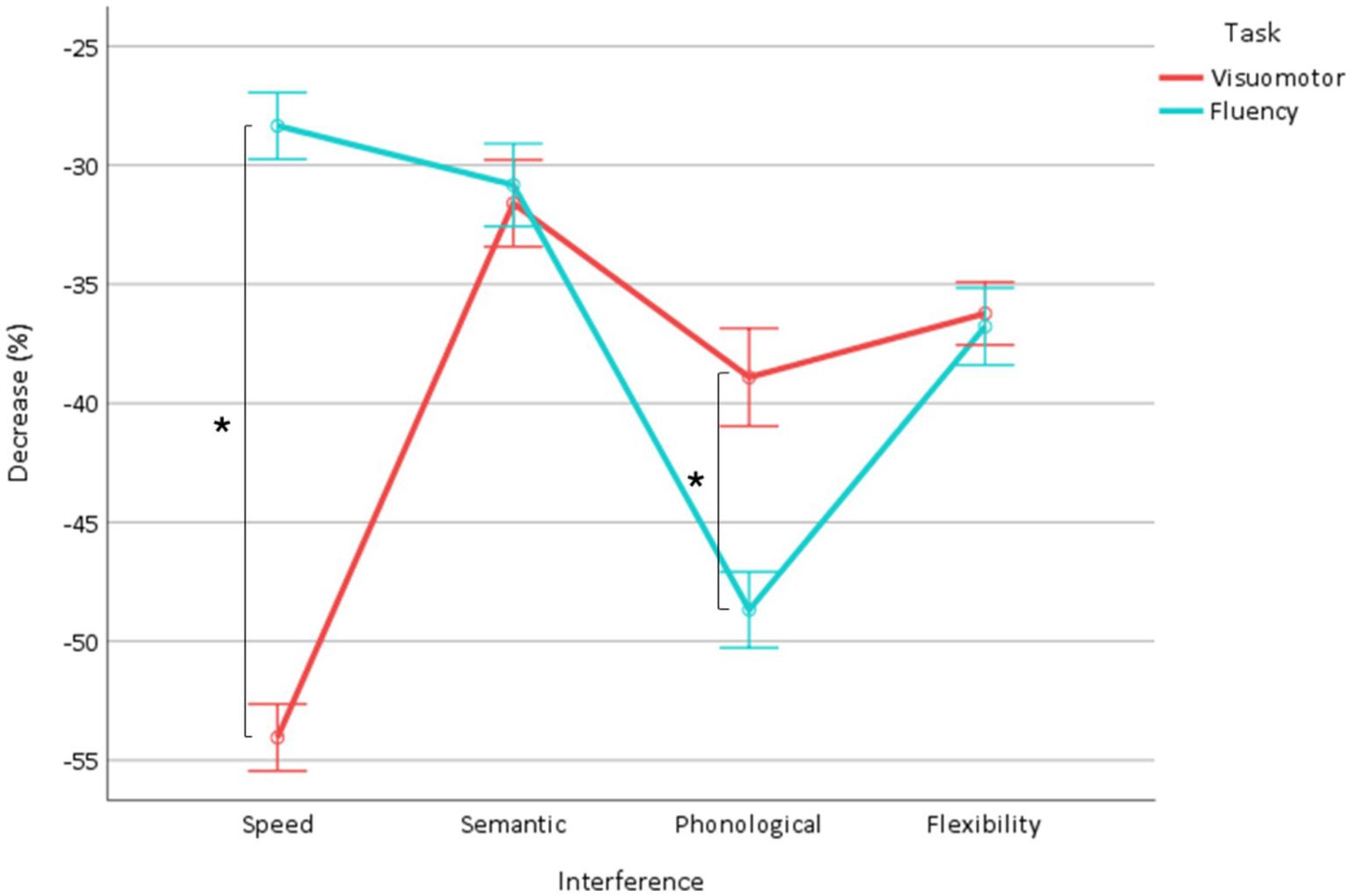Decrease in fluency and visuomotor interfering tasks as a function of interference (speed, semantic, phonological, flexibility). *Indicate significant interactions.