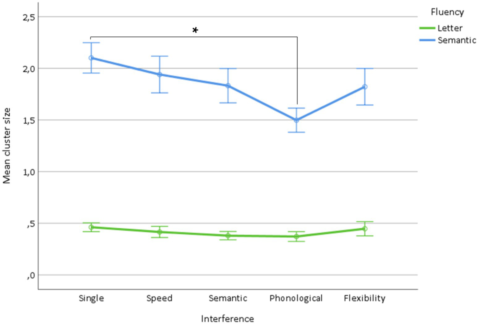 Mean cluster size for letter and semantic fluency as a function of the type of interference (single condition, speed, semantic, phonological, flexibility). *Indicate significant interactions.