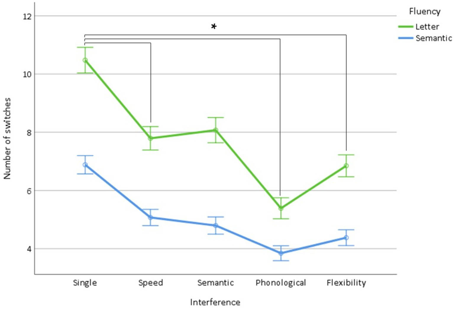 Number of switches in letter and semantic fluency as a function of interference (single condition, speed, semantic, phonological, flexibility). *Indicate significant interactions.
