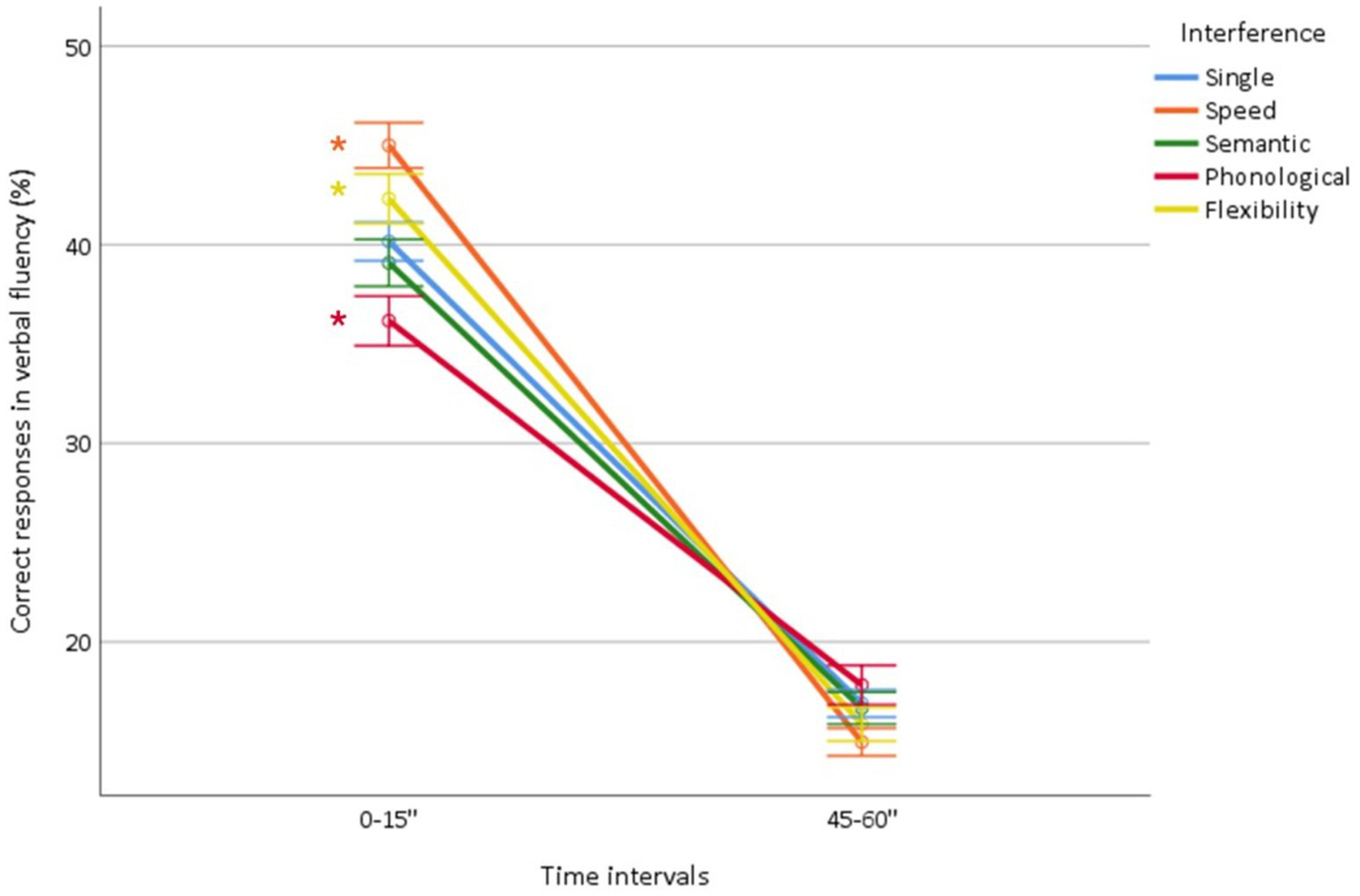 The effect of the four types of interference on the time course of production deliberately focused on the first and last time intervals (0–15″, 46–60″), which proved to be the most informative (Kassir et al., 2023). It was analyzed by repeated ANOVA with the within-subject factors of the time interval (0–15″, 46–60″), fluency (letter, semantic), and type of interference (single condition, speed, semantic, phonological, flexibility). The effects of interference were compared using simple contrast analyses.