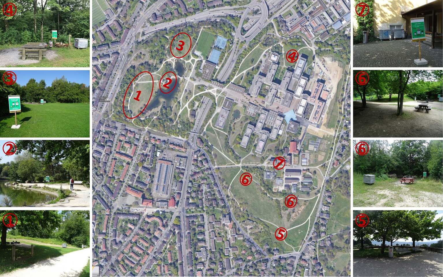 The design of the preparative study is a between-subject longitudinal study with a rolling sample. The park was divided into seven investigation zones, as marked in Figure 2. These zones were isolated by ridges and vegetations, so that it was not possible to see the posters from other zones, when standing in one zone. These topographic features of the park limited the number of zones that could be specified for this investigation. It cannot be ruled out that people heading to a picnic spot passed through other zones and, thus, might have been influenced by the posters of these zones. However, the zones were specified in a way that no other intervention zone had to be crossed if individuals used the shortest route from the nearest park entrance to the respective zone. If the different interventions would have been confounded, it would have reduced the observed effects for all posters.