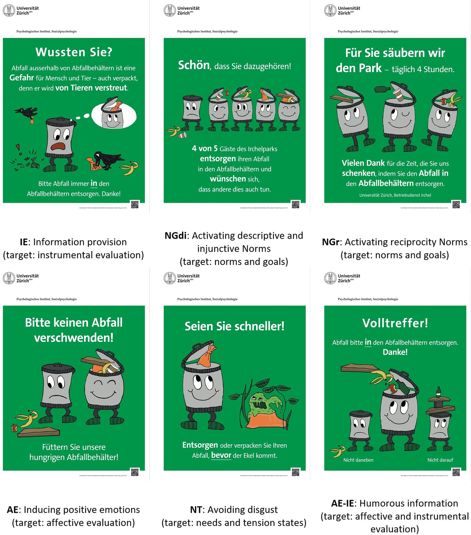 Figure 3 presents all types of posters used in this study. The poster targeting instrumental evaluation (IE) conveys information about why littering is problematic. It states in German: “Did you know? Garbage outside the garbage bin is a threat to humans and animals – even if it is packed because animals can scatter it. Please always dispose of garbage in the garbage bins. Thank you!”