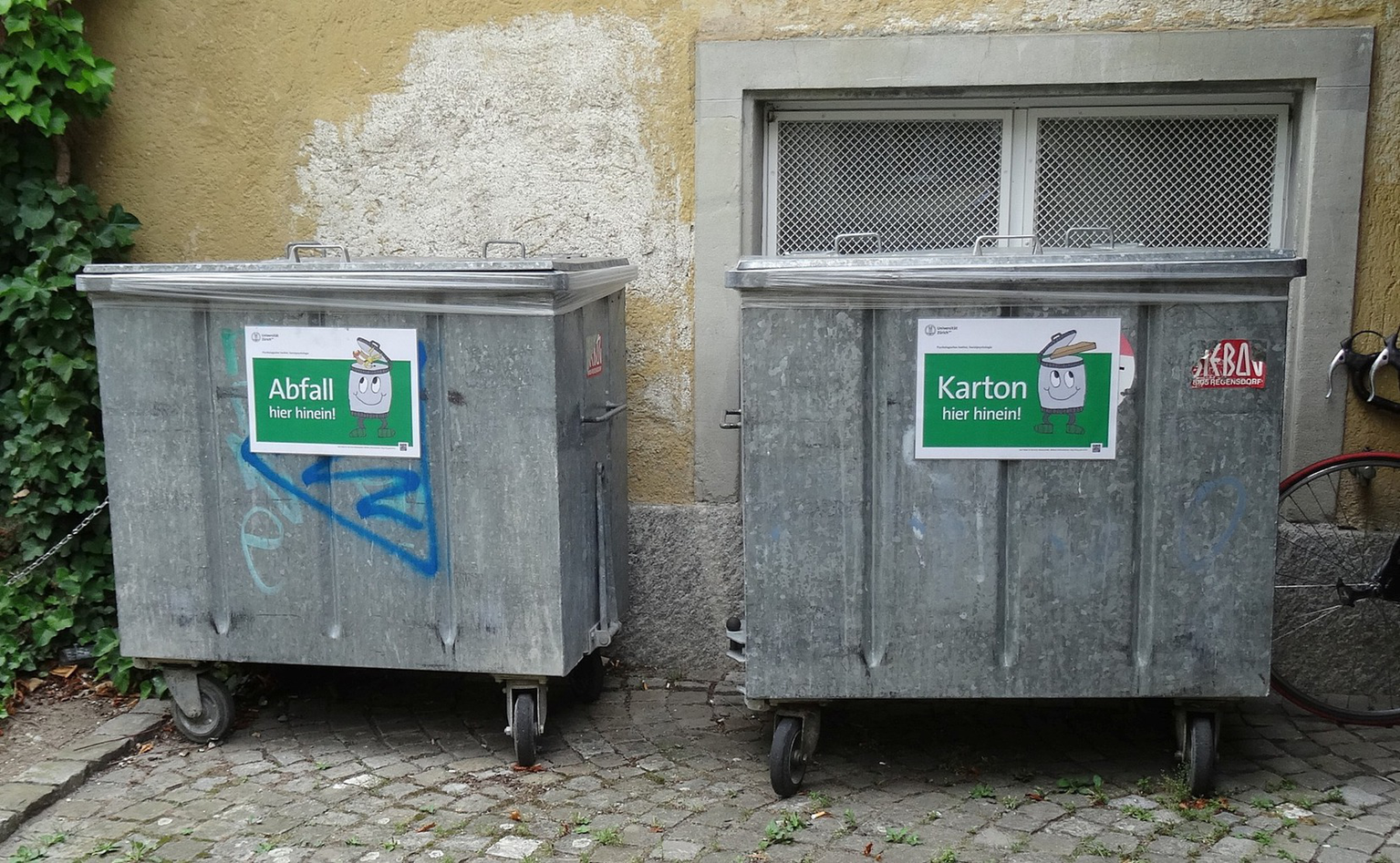 The problem targeted in Zone 7 was that cardboard, particularly pizza boxes, were often put beside or above the garbage container. We assumed a possible reason for this is that people would like to separate cardboard for recycling, as they do at home. So, as a structural measure targeting feasibility, affordances in the form of a second container only for cardboard was provided and/or the Poster AE-IE was used. The poster stated: “Bull’s eye! Please dispose of waste in the waste garbage container. Thank you. Not next to it. Not on top.” This poster targets affective evaluation with the humorous eyecatcher, but by more specifically explaining the behavior, it also targets instrumental evaluation. We targeted these two dimensions, because we deemed it necessary to explain the behavior (IE), and previous research indicated that humorous prompts are more effective (Hansmann and Steimer, 2016). When two containers were placed, they were further clearly marked (Figure 4).