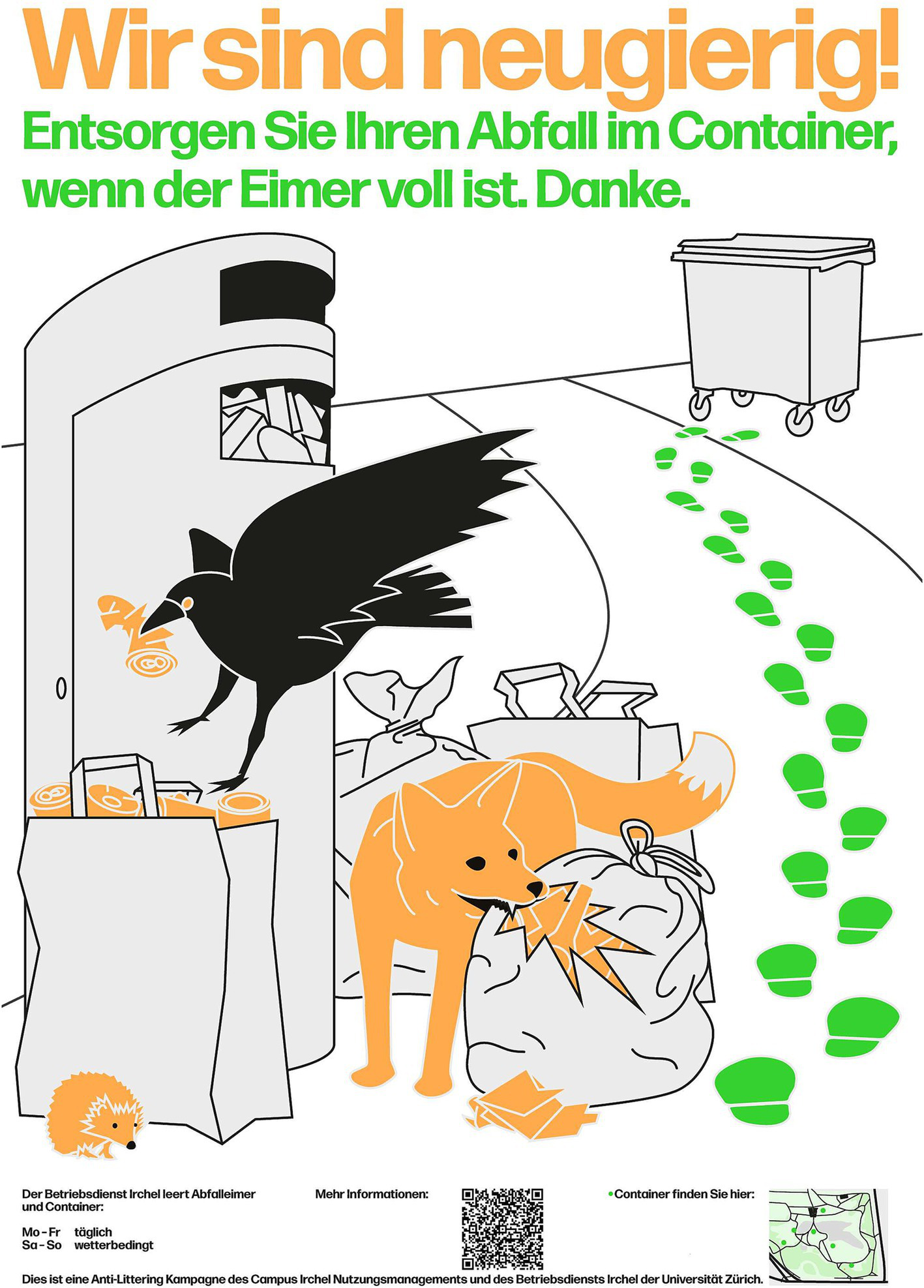 While much of the message of the posters could be conveyed graphically, some posters required a larger amount of text to better specify and clarify the message. The text was provided in German, which is the official language of Zurich and the dominant language of the park visitors. Key words were highlighted allowing the message to be captured in less than a second. The posters comprised a QR-code that linked to the project page. There, general information about the project was provided, but no specific information about the posters.