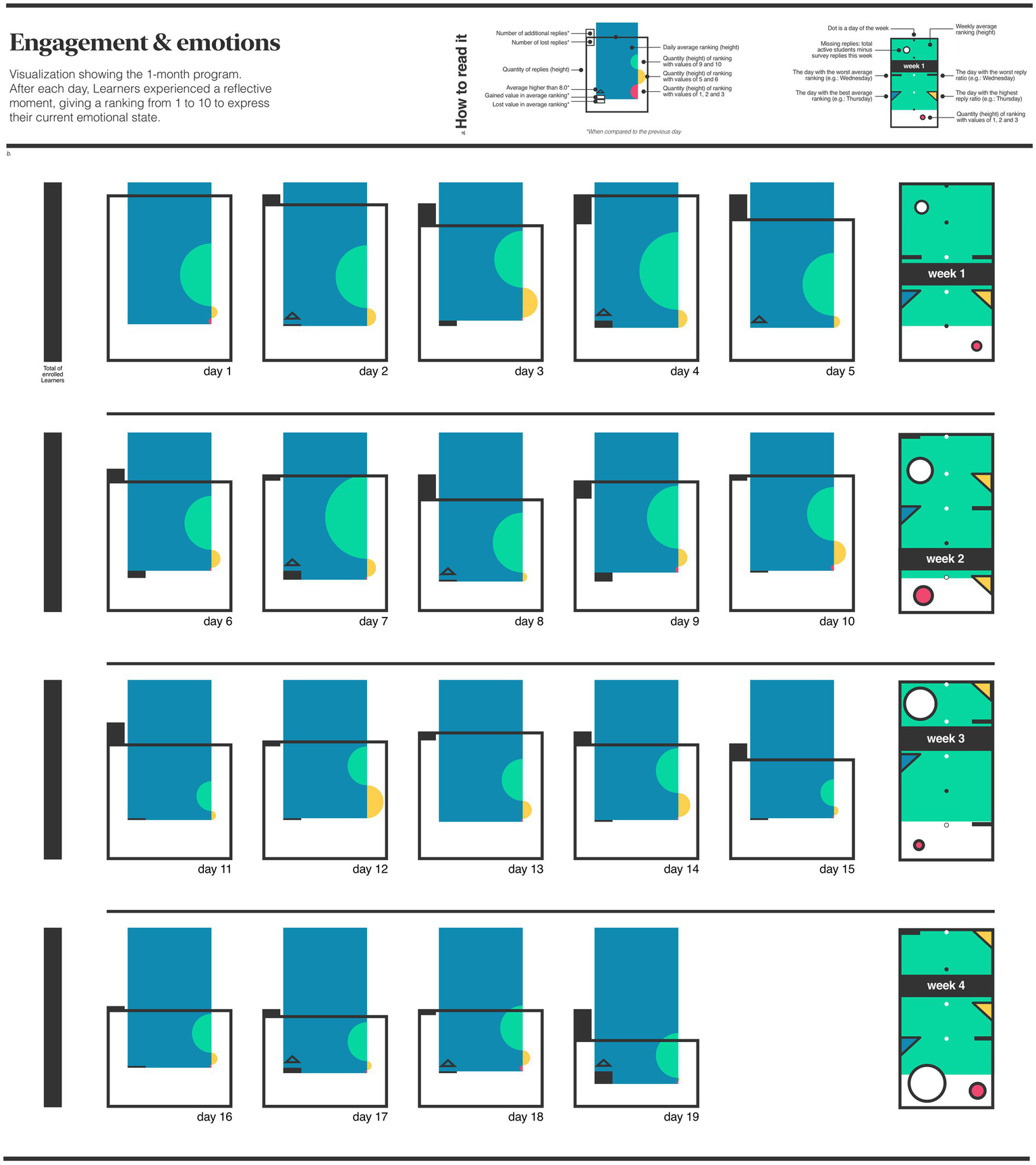 Figure 2. Educational program B. Data visualization of the average daily emotions of learners throughout a 1-month program. The ‘How to read’ section (A) provides a detailed explanation of each element in the image. The main part of the figure (B) visualizes the aggregated data collected throughout the program.