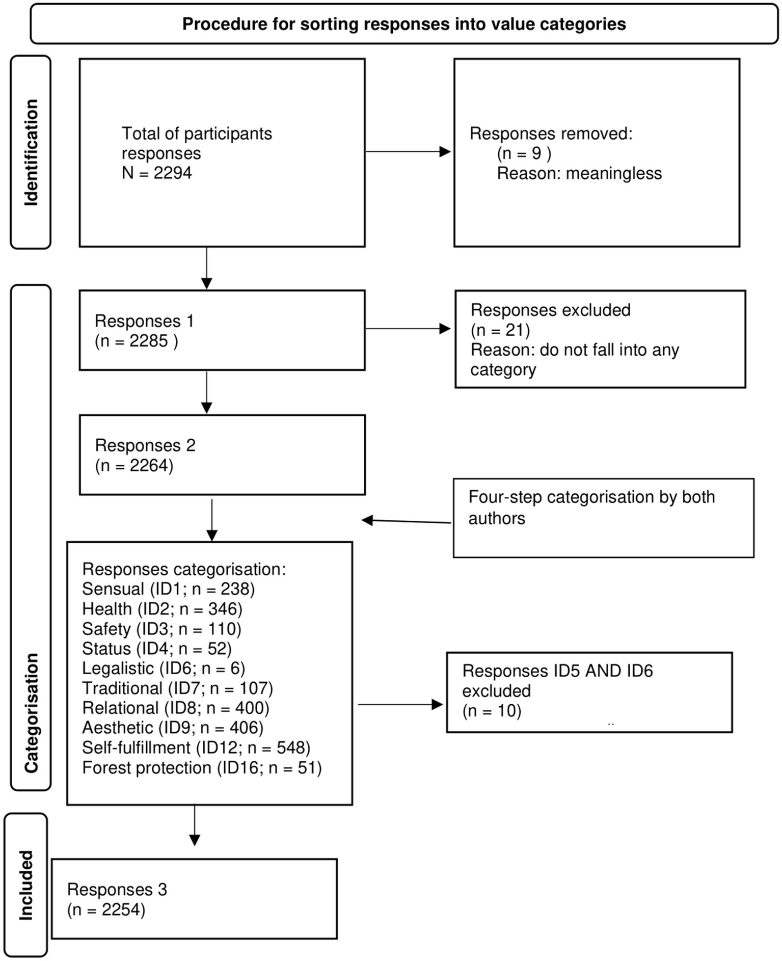 Content analysis was used to classify participants’ responses into 11 value categories, 9 of which were selected for further analysis due to the small number of responses (Figure 3; Table 1). The largest percentage of responses, namely 24.3%, was assigned to the self-actualization category, followed by aesthetics (18.0%), relational (17.8%), health (15.4%), sensuality (10.7%), safety (4.9%), tradition (4.8%), status (2.3%) and forest protection (2.3%). Patriotic (0.2%) and legalistic (0.3%) were underrepresented and were therefore not included in the further analysis.