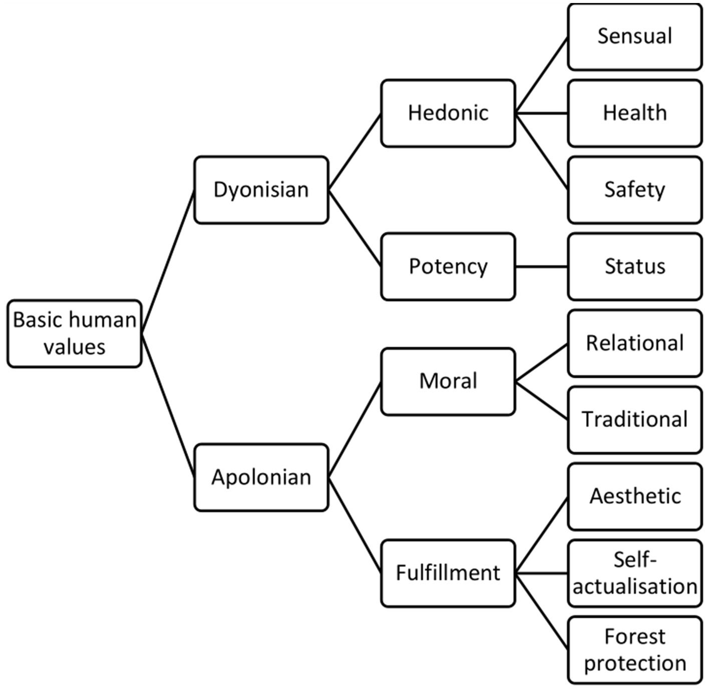Each of the four broad categories could be further subdivided to obtain the middle value categories: sensual values (pleasure, fun, exciting life), health values (health), safety values (security, peace of mind), status values (power, prestige, fame, money), patriotic values (love of country, national pride), legalistic values (order, respect for the law), traditional values (honesty, kindness, hard work), social and family values (family happiness, understanding for the partner, love, love for children), social and democratic values (equality, national equality, peace, style, justice), cultural values (culture, art, creativity), esthetic values (beauty, nature), actualizing values (knowledge, progress, self-improvement), cognitive values (truth, wisdom) and religious or spiritual values. Understanding these values is crucial when exploring human interactions with natural environments, such as forests, which are not only resources for physical needs but also for psychological fulfillment.